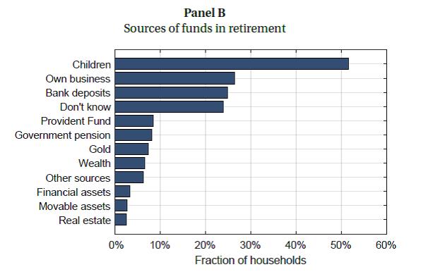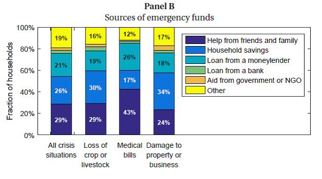 Thus far, we have identified a number of dimensions along which Indian household finance decisions are unusual relative to those of their counterparts in other countries. We now aim to dig a little deeper into the trade-offs and frictions that underlie these decisions. In the previous chapter, we looked into the variation of unconditional average shares of asset classes and credit products across households. We now control for household demographic characteristics. In this chapter, we add to the previous analysis by also deriving insights from a number of household surveys including the Financial Inclusion Insights Survey (2015), the Finscope Survey (2015), the 2015 wave of the NSS health survey, the 2015 UNDP population projections, and the ICE 360 national household survey. In addition, we continue to analyze household-level data from the 2012 wave of the Indian AIDIS survey, but now explain the wealth shares of households with an augmented set of categorical variables capturing wealth quintiles and education groups, as well as a set of other control variables including age quintile categorical variables, rural vs. urban residence, and the number of children. The tables and figures at the end of the chapter provide the source of the analysis for each statistic that we describe in the text. Household saving: financial assets vs. physical assets In the top panel of Figure 2.4, we first document a clear substitution effect between real estate and gold as households become richer. Conditional on age levels and other demographic characteristics, households in the top quintile of wealth have a 50% higher share of real estate and a 30% lower share of gold in their portfolio of assets. Interestingly, holdings of financial assets only play a relatively modest role, even for the wealthiest Indians. This is an important finding, and raises multiple challenges in the context of the future development of the Indian economy. We also note here that this may well be a symptom of income diversion, in addition to more standard cultural and behavioural factors.3 In particular, richer households may find it easier to place illicit earnings or engage in tax evasion by investing in real estate wealth, thereby avoiding the scrutiny associated with investments in the formal financial sector. Interestingly, the picture is very different when we turn to the role of education. Higher education is unambiguously associated with a lower share of real estate, and higher shares of both pensions and financial wealth. This finding suggests that education more generally (rather than financial education more specifically) has the potential to improve financial allocations, but may also be a proxy for the fact that higher education is correlated with employment in the formal sector - with fewer opportunities for tax evasion, and more exposure to formal financial markets. Household risk management: debt vs. insurance We now turn to understanding the source of financial uncertainty for Indian households, and the ways in which they use alternative vehicles to deal with unexpected realisations of risk. Panel A of Figure 2.5 describes the sources of major financial vulnerability for Indian households. We find that the events that have had the largest financial impact on the family during the 2 years prior to the survey date are the loss of crops or livestock due to bad weather, medical emergencies associated with hospitalisation, and damage to properties, farm equipment or other business capital, due to a natural disaster. Cumulatively, these events account for the major financial losses in more than 60% of cases. The next three sources in order of financial vulnerability concern reductions of the income-generating capacity of the household, due to job loss, an increase in the costs of agricultural inputs, or a deterioration in overall market conditions. Cumulatively, they account for the major financial losses of around 25% of households. Finally, life events such as theft/burglary, family separation, or the death of the main income earner are also important sources of financial risk, which may affect a considerable part of the population, but their overall financial impact seems to be much smaller than the other sources discussed above. How do households cope with these risks? Figure 2.5 suggests that India is still largely an informal economy. Only a quarter of households are able to deal with emergency expenses by drawing upon accumulated wealth. Instead, half of the population counts on help from family, friends and moneylenders. Most notably, loans from formal financial institutions are virtually irrelevant as a coping mechanism, which suggests that the financial system fails to achieve one of its most important goals of helping households smooth cash flows and consumption patterns. The problem seems particularly acute when we look at medical expenses. 69% of households deal with medical expenses by drawing upon informal sources of funding, 26% of which are loans from moneylenders. We note here that help from family and friends is generally perceived as benign. It may indeed be associated with low costs, but we note that payments on such loans are generally non-pecuniary and involve service delivery by family members, which often goes unreported and thus leads to an underestimate of true costs. They are also viewed as easy to renegotiate, although there may be social quid pro quo accompanying such loans. On the positive side, there is potentially less asymmetric information in such loans, they can be issued at relatively low ticket sizes, and be accompanied by non-monetary assistance. Overall, though, we caution that this type of informal lending can pose significant pressures on family structures, and likely also lead to psychological burdens that cannot be ignored (see Lee and Persson (2016)). Moreover, Figure 2.6 shows that loans from family and friends, and in particular loans from moneylenders, are much more likely 