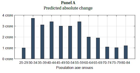 To answer point ii) in the ToR, we now turn to documenting the likely evolution of the Indian household finance landscape, using demographic growth rate information. There are two main reasons to make such future projections. First, it can help to envision the implications of household behaviour for aggregate quantities in Indian financial markets. Second, if problems are confined to certain cohorts of the population (say, the elderly), some of the problems that we have documented above may in fact be self-correcting, and projections are a useful tool to be able to see whether this is indeed the case. To do these projections, we start by reporting the likely evolution of the Indian population during the coming decades. In Figure 2.11, we use data from Prof. Irudaya Rajan of CDS to show that the largest growth in absolute terms is expected to occur in the middle of the age distribution (around 148 million individuals by 2031). If these households maintain their current household finance allocation patterns, this demographic projection implies additional demand pressure for assets such as gold, land, and real estate. In relative terms, while the growth rate of the middle cohort is expected to reach 54 percent by 2031, the age group with the highest expected growth rates are elderly retirees, aged 65 years and above. Over the coming decade and a half, this cohort is expected to grow by 75 percent. Since only a small part of this cohort is adequately covered through private pension plans, and a large part of the population did not actively take steps to insure adequate financial coverage during retirement (see Figure 2.10), the financing of health expenses and consumption during retirement is expected to leave older households particularly vulnerable to adverse shocks. To further understand the quantitative implications of these changes in the Indian population, we implement a two-step procedure. We begin by calculating total state-level assets and liabilities, using average holdings by each household age group in each state from the 2012 AIDIS survey. We then calculate projected average holdings of financial products by 2031, based on the projected population distribution for each state, and use these counter-factual total state-level quantities to obtain projected levels and growth rates in household demand over the next 15 years, for each asset and debt category. Panel A of Figure 2.12 shows that the largest expected growth (in absolute terms) is in real estate. If the current trend continues, we expect an increase in housing demand by around 45% – in real terms. There are two conclusions that we can draw here: On one side, absent massive investment in new housing construction, this development is likely to put large pressure on house prices, potentially decreasing affordability even more, and especially in the urban centres where the young population is likely to cluster. But at the same time, even if housing supply reacts by expanding greatly, it seems inefficient for an economy to allocate such a large portion of its total wealth to a single sector. This is especially relevant because, as we report in Panel B of Figure 2.12, the average share of real estate in household wealth is likely to actually increase, while the share of financial assets is projected to remain constant. Therefore, not only will the housing market be subject to large demand pressure, but any price volatility will generate more uncertainty for the average Indian household, as it gets more and more undiversified by holding larger and larger amounts of real estate. We note that the average wealth share of real estate is projected to rise because we expect relatively higher population increases in the part of the population that is more likely to have a higher share of real estate (i.e. the middle-age and older generations). Importantly, we also project that the mortgage share is increasing: the mortgage market is expected to grow by around 41%, and the share of mortgages in the overall portfolio of household debt is likely to increase by 3 percentage points. However, on net, the overall amount of housing equity on household balance sheets looks set to increase if nothing changes. Overall, we conclude that, absent significant changes in household behaviour, the problems that we have identified above will continue to prevail in the Indian economy. We next attempt some quantification of potential financial benefits to Indian households from implementing such changes in behaviour. 2.4 Gains from re-allocation of household wealth HIGHLIGHTS