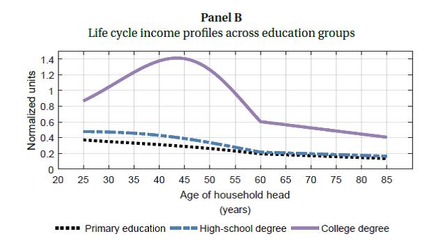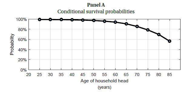 While it is difficult to capture the diversity of preferences, constraints and institutional arrangements that households face in a single theoretical framework, there are some relatively universal implications delivered by all benchmark models in the field of household finance about optimal decisions along the life cycle. (i) All households should participate in financial markets, saving a strictly positive amount in risky assets such as publicly traded stocks, (ii) The portfolio exposure to risky assets should be largest in young age and drop off substantially as people approach retirement, (iii) Most debts should be incurred during the first years of activity in the labour market, (iv) Mortgages are generally the largest household liabilities, and (v) Savings of both financial and non-financial assets should substantially reduce as people age. To some degree, all of these predictions are different from the observed patterns of behaviour for Indian households. One possible reason is that the parameters that have been previously used to calibrate theoretical models do not adequately capture the institutional situation in India. Our theoretical analysis therefore begins with a calibration exercise which uses Indian data to estimate conditional survival probabilities along the life cycle, the dynamics of expected income, and the profiles of financial market risk and return (see Figure 1.7). We have constructed and calibrated a lifecycle portfolio choice model of household financial decisions, which we are using to explore whether the observed empirical patterns can be reconciled with theoretically optimal predictions. We note that the model is selected to have a useful role for durable goods, thus giving it the best possible chance of models in this class to rationalise the patterns we detect in Indian household data. The model economy is assumed to be comprised of agents that live up to a maximum of T = 100 years. For each age group, the remaining life span is uncertain, and given by the conditional probability of survival. In each period, the household head receives labour income, which is randomly shocked using draws from a probability distribution. We assume the household is exposed to two types of such labour income shocks: temporary shocks, e.g. minor health issues, or a financial bonus, have only a transitory effect on the financial situation of the household, limited to just a few months; permanent shocks, such as an accident, physical disability, a significant promotion or a shift in occupational status, have a much more pronounced long-term impact. We choose to distinguish between education groups because this type of variation is measured without noise and we need a parsimonious specification to discuss the heterogeneity of household finance decisions across the Indian population. Of course, the heterogeneity across education groups also captures variation across occupation categories, regions of residence, and employment sectors. Households are risk-averse and choose to save some of the income they receive, and to consume the rest. They derive consumption utility from pure consumption goods such as food, but also durable goods such as residential real estate, vehicles, mobile phones and gold. For their savings in the form of financial assets, households earn a risk-free return. The value of durable goods depreciates at a constant rate in each period. Households can take on unsecured debt, i.e. credit contracts simply backed by their future labour income, and also secured debt, where their stock of durable goods serves as collateral for a loan. Importantly, we assume that durable goods are also illiquid, and households pay an adjustment cost whenever purchasing or selling them. In each period, a strict collateralization constraint guarantees full repayment, i.e. we assume that agents do not default on their payments, but they can roll over any debt indefinitely. Figure 1.8 illustrates the optimal decisions of Indian households, as implied by the life cycle model. The two panels report the average levels of net financial assets (i.e. the difference between investments and debt) and physical assets (i.e. real estate, vehicles and gold), for different age groups. In the early years of household formation, the accumulation of financial assets is slow, and most households are indebted, to be able to afford investments in real estate and other durables. More wealth is accumulated towards the middle age, a large part of which continues to be in physical form. In the top panel of Figure 1.9, we calculate the allocation profiles of wealth for the average household explicitly. The profiles are similar across all education groups. First, the relative share of physical assets is larger at the beginning of life. The first ten years in the labour market, when the income profile is generally expected to be upwards-sloping, is a period in which it makes sense to invest in durable goods, and to enjoy the utility associated with them for long periods of time thereafter (e.g. an apartment, a transportation vehicle, or gold jewellery). Second, in middle age, the share of physical goods is gradually decreasing, allowing for the accumulation of financial wealth. Finally, after retirement, financial wealth is drawn down more rapidly than physical wealth, which increases the relative allocation towards physical wealth. The bottom panel reports the optimal share of the population that participates in the debt market. Consistent with the significant role of physical assets at the beginning of life, we find that this is the period when most households incur substantial liabilities. Importantly, our results suggest that later in life, and especially during retirement, it is optimal to use products that resemble a reverse mortgage arrangement. The property or physical asset is still retained in the possession of the household, but it is used as collateral for loans, to insure a steady stream of consumption