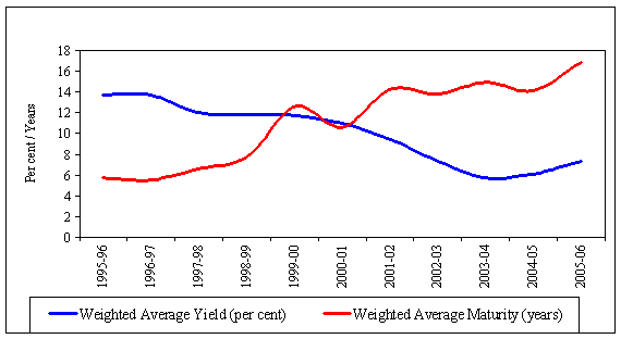 It is pertinent to add here that recently the Government of India converted (non-tradable) special securities amounting to nearly Rs.900 billion issued to banks towards capital infusion, into tradable, SLR Government of India dated securities. The substitution of non-tradable securities to tradable securities is expected to facilitate increased access of the banking sector to additional resources for lending to productive sectors, in the light of the increasing credit needs of the economy. It may be also important to note that the Reserve Bank has been encouraging the growth of the collateralized money market with the objective minimizing default risk in the money market. As a consequence, there has been a major shift in transactions from the uncollateralized to the collateralized segment, underscoring the development of the G-sec market. During the greater part of the 1990s, the maturity of Central Government securities ranged upto 10 years. This resulted in potential redemption pressure and rollover risk. With a view to address these concerns as also to develop the yield curve for longer tenors, the Reserve Bank progressively increased the tenors upto 30 years by early 2000. As a consequence, the weighted average maturity of securities increased from 5.5 years in 1995-96 to 16.9 years in 2005-06; the weighted average maturity during 2006-07 so far works out to 14.6 years. The weighted average yield of securities also declined from 13.8 per cent in 1995-96 to 5.7 per cent in 2003-04. Since then, it has increased to 7.3 per cent in 2005-06 and further to 7.9 per cent in 2006-07 so far. Chart 3: Weighted Average Yield and Weighted Average Maturity