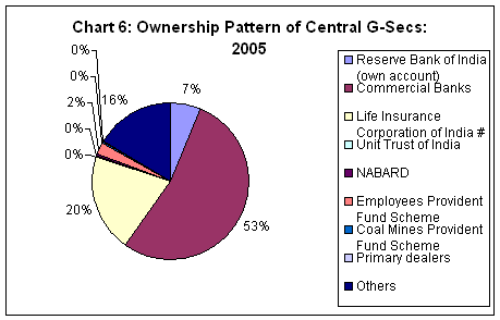 Chart 4: Central G-secs Yield Curves The process of passive consolidation (through reopening of existing stock instead of issuing new securities every time) has helped in containing the number of bonds around the level that was prevailing at the end of 1998-99. This was a significant factor that promoted secondary market liquidity for Government Securities. Market liquidity today compares well not only with the emerging economies, but also with the developed world, with bid-offer spreads in benchmark securities at 1-2 bps. The illiquidity premium levels are also in line with those in the international markets. The holding of G-secs among financial institutions has been more persified, particularly, with the emergence of insurance and pension funds as a 'durable' investor class for the long-term securities. This became possible due to the sustained efforts devoted to elongating the maturity profile of Government securities by developing a smooth and robust yield curve.