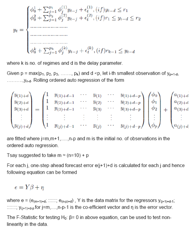 G. Tsay’s F-Test Tsay’s Test procedure provides a robust test procedure for testing the presence of threshold non-linearity in any data generating process. The null hypothesis and alternative hypothesis of Tsay’s Test states the following – H0: Xt follows linear process vs H1: X1 have SETAR(j) process One of the major challenge in testing the hypothesis is that the thresholds are observable under H1 only. Tsay (1989) proposed F-test using auxiliary regression in order to avoid dealing with the threshold directly. The basis of Tsay’s test lies on arranged auto regression and recursive least square technique. A k-regime SETAR Model is given by
