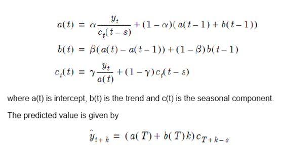 Simple exponential smoothing (mentioned in (1)) is quite simple in nature and cannot be adopted in case the underlying data contains trend and/or seasonal factors. Hence, double and triple exponential smoothing techniques are used to take care of the trend and seasonal component, respectively. Double Exponential smoothing Double exponential smoothing considers smoothing of the raw data as well as the estimated trend component separately and uses those estimates to predict the future values. Majorly two methods are used under double exponential smoothing – Holt-Winters double exponential smoothing Holt-Winters double exponential smoothing uses smoothing in 2 stages –