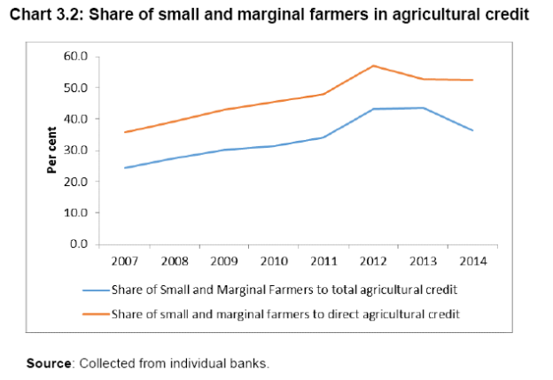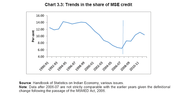 II. Priority Sector Programme in India: An Analysis 3.9 There is a large body of literature examining the impact of financial intermediation on economic growth. Empirical findings broadly support the view that financial development has strong influence on economic growth and financial market imperfections have an impact on investment and growth.10 However, despite being one of the largest and longest public policy intervention programmes in the world, empirical evidence of the efficacy of PSL meeting its final objectives has been limited. It turns out to be a relatively tricky issue, and even referred to as “a gaping hole in the entrepreneurship development literature”.11 3.10 In the case of agriculture credit, when the farmer faces a credit constraint, additional credit supply can raise input use, investment, and hence output. This is the liquidity effect of credit. But credit has another important role. In most developing countries where agriculture still remains a risky activity, better credit facilities can help farmers smooth out consumption and, therefore, increase the willingness of risk-averse farmers to take risks and make agricultural investments. This is the consumption smoothing effect of credit. 3.11 In the case of India, early evidence based on detailed district level data suggest that in agriculture, the output effect of expanded rural finance is not large, despite the fact that credit to agriculture has strongly increased fertilizer use and private investment in machines and livestock. This means that the additional capital investment has been more important in substituting for agricultural labour than in increasing crop output. However, the impact of rural credit and the expansion of the rural financial system on rural wages have been positive, as the creation of non-farm employment has added more to total employment than has apparently been subtracted by the substitution of capital for labour in agriculture.12 Relatively recent evidence suggests that directed lending may have a consumption smoothing effect. However, evidence also suggests that it has contributed towards increased consumption inequality in rural India.13 3.12 Taking a sectoral approach, the Working Group attempted the quantification of the impact of PSL to agriculture and observed positive elasticity of credit to output based on district-level data for four States viz., Maharashtra, Andhra Pradesh, West Bengal and Punjab for the period 2004 to 2009.14 These findings broadly match with those in the literature that bring out a positive role played by agricultural credit in supporting the purchase of inputs and aiding growth in the agricultural sector.15 3.13 Further analysis based on the total credit to agriculture, and then separately for direct and indirect credit to agriculture suggests that the intervention through direct agriculture credit has a positive impact on agriculture output. This effect, however, was not statistically significant for indirect credit reflecting its limited role.16 Finally, the Working Group also examined how changes in growth of agricultural credit affected the growth of gross value added from agriculture based on a SVAR framework.17 The estimated impulse response showed that the increase in growth of agriculture credit positively affects the growth of agricultural value added. 1. Growth and distribution of credit to major priority sectors 1.1 Agriculture 3.14 Agriculture has figured prominently in the list of sectors included under PSL for commercial banks in India right from the inception of this programme. Even though there has been a decline in the contribution of agriculture to India’s domestic product, its share in total employment has remained high. 3.15 Over the last two decades of economic reforms, the share of agricultural credit to total bank credit has shown variations but has broadly remained within the band of 10 to 12 per cent (Chart 3.1). The pattern was broadly of a decline over a major part of the 1990s followed by a revival over the 2000s (Table 3.2). During the 2000s, a notable increase in this share could be seen during the first half of the decade, which was a period when the Comprehensive Credit Policy was initiated by the Central Government for reviving the growth of agricultural credit. The 1990s was a period of slower growth in bank credit to agriculture, which picked up in 2000s marginally exceeding even the overall growth in bank credit during this decade. 3.16 Two noteworthy features of bank credit to agriculture since the early 1990s have been the following: First, there has been a rise in share of indirect agricultural credit in total agricultural credit. This could be gauged from the widening gap between the shares of total and direct credit. 3.17 Secondly, small and marginal cultivators (operating less than 5 acres of land) have not received their due share in the distribution of agricultural credit despite the fact they account for more than 80 per cent of total cultivators in India.18 The increase in the share of small and marginal farmers is, in part, attributable to the subdivision of land given the high land-man ratio. However, given their major contribution to overall agricultural production, food security and diversification within agriculture in India, they remain legitimate claimants for an increased allocation of agricultural credit (Chart 3.2).19 1.2 MSE sector 3.18 Over the last two decades, the share of credit to MSEs showed a broadly similar trend as that of agricultural credit, first posting a decline and then showing some signs of revival with the broadening of the definition of the MSE sector after 2006-07 (Chart 3.3). Further, similar to agriculture, the 1990s was a period of relatively slow growth in credit to SSI sector, a trend that was reversed over the 2000s, particularly after 2006-07 (Table 3.3). 3.19 Notwithstanding the pick up, concerns about a gap in credit allocation to MSE sector have remained. As per the ava