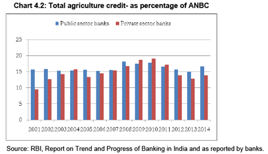 Priority Sector Lending – Targets and Definitions 4.1 This chapter begins by looking at the present targets and definitions for Priority Sector Lending (PSL) and then reviews the achievements by banks in the recent period and while examining the sectors of national priority, suggests revisions in the approach, definitions and targets of PSL. I. Priority Sector 4.2 As per the extant guidelines, domestic banks are required to meet a target of 40 per cent of their Adjusted Net Bank Credit (ANBC) or Credit Equivalent of Off-Balance Sheet Exposure (CEOBE) of the preceding March 31st, whichever is higher, for priority sector lending. Foreign banks with 20 and above branches have also been brought on par with domestic banks w.e.f. July 20, 2012 and these banks have to achieve the targets over a period of five years. The prescription for foreign banks with less than 20 branches is 32 per cent of ANBC or Credit Equivalent of Off-Balance Sheet Exposure (CEOBE) of the preceding March 31st, whichever is higher. 4.3 At the aggregate level, domestic banks have by and large achieved the overall target of 40 per cent in the recent years (Appendix 1.1 and Chart 4.1). Between 2001 and 2014, except for two years, the shortfall has been less than 1 percentage point. Further, the number of years when banks exceeded the target outnumbered the number of years having a shortfall. Notwithstanding the low magnitude of default, there was a discernible decline in the percentage of PSL after 2008, which was somewhat reversed only in 2014. Foreign banks achieved more than the target of 32 per cent during this period. 4.4 Continuance with directed lending programme (DLP) is a necessity in the Indian context. In the absence of such prescriptions, lending to the important sectors like agriculture and Micro and Small Enterprise (MSEs) would not have taken place to the desired extent. In view of the continued need for making credit available to various priority sectors on grounds of growth and equity and the fact that banks have been hovering around the set target in lending to the priority sector leads to the conclusion that the target should be kept intact. The feedback received from bankers underscore the need to continue with a target-based approach to ensure the flow of credit to priority sectors. The Working Group, therefore, recommends that the target for lending to the redefined priority sector may be retained uniformly at 40 per cent of ANBC or Credit Equivalent of Off-Balance Sheet Exposure (CEOBE), whichever is higher, for all scheduled commercial banks. Foreign Banks with more than 20 branches were given the same targets as domestic banks in 2012 giving them time up to March, 2018 to comply. They were also advised to submit the action plans for achieving these targets. Remaining Foreign Banks (with less than 20 branches) continued to have 32 per cent priority sector lending target. Admittedly, there are certain constraints for foreign banks, like their limited presence owing to branch licensing restrictions and lack of experience in lending to certain sectors. However, it is felt that given the enhanced scope and alternative avenues made available for achievement of priority sector targets, they will also be able to achieve the targets similar to those for domestic banks. In Chapter 5, the Working Group has made recommendations for the introduction of Priority Sector Lending Certificates (PSLCs). These instruments would provide a mechanism for banks with lesser number of branches to achieve the prescribed targets and sub-targets. The Working Group, therefore, recommends that all foreign banks (irrespective of number of braches they have) may be brought on par with domestic banks and the same target/ sub-targets may be made applicable to them. The overall target of 40 percent and sub-targets, as mentioned in the following paragraphs, may be made applicable to all the foreign banks. Foreign banks with 20 and above branches may be given time up to March 2018 and other foreign banks may be given time up to March 2020 to comply with the targets/sub-targets as per the action plans submitted by them and approved by the Reserve Bank. II. Agriculture 4.5 Agriculture credit has been considered eligible for priority sector lending for over four decades. Within the priority sector, a sub-target for the direct financing of agriculture and allied activities was set at 15 per cent of net bank credit to be achieved by 1985, which was subsequently raised to 16 per cent by March 1987, 17 per cent by March 1989 and 18 per cent by March 1990. The sub-target of 18 per cent was further bifurcated in 1993 to a minimum of 13.5 per cent for direct loans and a maximum of 4.5 per cent for indirect loans. Indirect lending above 4.5 per cent of ANBC was not taken into account for computation of achievement under the 18 per cent target, but was considered as overall priority sector lending. In April 2001, private sector banks were advised to achieve the target of 18 per cent of net bank credit for lending to agriculture within a time period of two years. Agriculture targets were made applicable to foreign banks with 20 and above branches from April 2013 and were given time till March 2018 to achieve the same. II.1 Trends in Agriculture Credit The Working Group looked at various trends in agricultural credit before making recommendations for this sector. 4.6 The performance of domestic scheduled banks in terms of achievement of agriculture targets was less satisfactory. The shortfall from the targeted level (of 18 per cent) was more than 2 percentage points every year between 2001 and 2014 for all SCBs except for three years between 2008 and 2010. On an average, the percentage of credit to agriculture under PSL was about 16 per cent in the years after 2001. The achievement of agricultural targets was relatively better for public sector banks than private sector banks (Appendix 1.2 and Chart 4.2). II.2 Direct vs. Indirect Agriculture Lendi