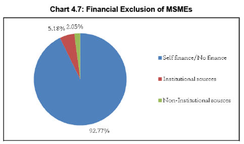 In view of the above classification, distinction between ‘direct’ and ‘indirect credit’ is no longer necessary. 4.13 The question, however, is the extent to which credit should be allocated to agriculture. In order to address the issue of credit allocation to agriculture, the Working Group has followed a model-based approach details of which are furnished in the Annex 2, to this Chapter. While presently the Working Group has recommended that the agriculture lending target be retained at 18 per cent of ANBC, it is suggested that the metric defined in Annex be used to reset this target every three years depending on the function of three variables viz., contribution of agriculture to the GDP, employment and number of credit accounts.. Agri-processing, presently included in MSE Sector, is proposed to be brought into agriculture fold. Considering the needs of small and marginal farmers and based on their share in the operating area as explained in para 4.10 above, within the agricultural target of 18 per cent of ANBC, a sub-target of 8 per cent of ANBC is recommended for small and marginal farmers, which may be achieved in a phased manner within a period two years i.e., 7 per cent by March 2016 and 8 per cent by March 2017. Foreign banks may be given time till the operationalisation of the PSLC Scheme for achieving the sub-target prescribed for Small and Marginal Farmers, given their more limited access to rural areas. 4.14 The remaining 10 per cent of the overall agriculture target of 18 per cent may be utilised by banks for lending for farm credit to other farmers as well as agricultural infrastructure and ancillary activities. Perceiving the huge need to create the rural infrastructure and processing capabilities and to give a fillip to the same, the Working Group has decided to not put any caps on the loan limits for agri-processing and agriculture infrastructure. This will facilitate and develop the credit absorption capacity of the farmers and help to create rural infrastructure and processing capabilities over a reasonable period of time, which will have a multiplier effect on the development of this sector. 4.15 For the purpose of the sub-target of 8 per cent for small and marginal farmers, the Working Group has defined them to include: - Farmers with landholding of up to 1 hectare are considered as Marginal Farmers. Farmers with a landholding of more than 1 hectare but less than 2 hectares are considered as Small Farmers. - Landless agricultural labourers, tenant farmers, oral lessees and share-croppers. - Loans to Self Help Groups (SHGs) or Joint Liability Groups (JLGs), i.e. groups of individual small and marginal farmers, provided banks maintain disaggregated data of such loans, directly engaged in Agriculture and Allied Activities. - Loans to farmers' producer companies of individual farmers, and co-operatives of farmers directly engaged in Agriculture and Allied Activities, where the membership of small and marginal famers is not less than 75 per cent by number and whose land-holding share is also not less than 75 per cent of the total land-holding. III. Micro, Small and Medium Enterprises 4.16 Fostering a dynamic micro, small and medium enterprise sector for sustenance of economic development is a priority for the policy makers, in both developed and emerging economies. In India too, Micro, Small and Medium Enterprise (MSME) sector plays a pivotal role in generating employment, increasing cross - border trade and fostering the spirit of entrepreneurship. As per the data released by the Ministry of MSME, Government of India, there are about 26.1 million enterprises in this sector. The sector accounts for 45 per cent of manufactured output, close to 40 per cent of all exports from the country and employs nearly 59.7 million people, which is next only to the agricultural sector. 4.17 However, the extent of financial exclusion in the sector is very high. The statistics compiled in the Fourth Census of MSME sector (2006-07) revealed that only 5.18 per cent of the units (both registered and unregistered) had availed of finance through institutional sources, 2.05 per cent had finance from non-institutional sources and the majority of units i.e. 92.77 per cent had not availed any external finance or depended on self-finance (Chart 4.7). 4.18 The Government of India, recognising that the manufacturing sector has a multiplier effect on the creation of jobs, has, in the National Manufacturing Policy, proposed to enhance the share of manufacturing in GDP to 25 per cent by 2022. The share of manufacturing in India’s GDP has stagnated at 15-16 per cent since 1980 while the share in comparable economies in Asia is much higher at 25 to 34 per cent. Given the contribution of the MSME sector in manufacturing and employment generation, it is imperative that the MSME sector as a whole is given priority. 4.19 Medium Enterprises (MEs) were not included in priority sector earlier as it was felt that the sector has access to credit and including the same would crowd out finance to the micro and small enterprises. However, the data on outstanding credit to MEs since March 2011 to March 2014 (Appendix 1.6) shows that while the outstanding credit to these enterprises over the years has increased, the number of units financed has declined. Further, credit to MEs as a proportion to non-food credit has less than halved to 2.4 per cent in 2014 from 5 per cent in 2008 as may be seen from the Chart 4.8. 4.20 In November 2013, Reserve Bank of India announced certain measures to increase liquidity support to MSMEs which, inter alia, included extension of the PSL status to incremental loans to medium enterprises (MEs) till March 2014. The feedback from bankers suggested that the measure helped to ease the liquidity pressures faced by the MSME enterprises. In view of the above, the Working Group recommends extending PSL status to medium enterprises in addition to the micro and small enterprises. Thus th