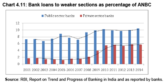 4.37 The target for lending to weaker sections has not been achieved by the banks as a whole, although some individual banks have been achieving the target (Appendix 1.8). The following chart shows that in percentage terms, credit to the weaker sections as defined above has been increasing over the years and has come close to the stipulated target of 10 per cent (Chart 4.11). 4.38 The private sectors banks, especially new private sector banks, however, are lagging behind and are far below the set target. The target of weaker section is not applicable to foreign banks with branches less than 20. For the Foreign banks with 20 and above branches, the weaker section target is applicable since July 2012 and they have been given time upto March 2018 to achieve it. 4.39 Considering that, of the priority sector lending, vulnerable sections of the society should get a reasonable share of bank credit, the Working Group recommends that existing categories and the target of 10 per cent of ANBC for loans to weaker sections may continue and be made applicable to all banks. However, it recommends that the extant loan limit up to Rs.50,000 for women as well as artisans and cottage and village industries may be raised to Rs.1,00,000. The Working Group recommends that only those women beneficiaries with a sanctioned loan limit of Rs.1,00,000, who are not covered by any of the other segments in the weaker section, may be eligible for inclusion. VIII. Social Infrastructure 4.40 As suggested by the Working Group earlier in this chapter, finance extended by banks for creation/ development of certain infrastructural facilities relating to agriculture (such as minor irrigation, development of market yards, etc.) is included under priority sector. 4.41 Given the importance of social infrastructure for development and its impact on ultimate credit absorption in rural and urban areas, the Working Group recommends that financing for building infrastructure for certain activities as specified below, in areas below Tier I, i.e., Tier II to Tier VI (Areas with population less than 1 lakh), may be treated as a separate category under priority sector, subject to a ceiling of Rs.5 crore per borrower: