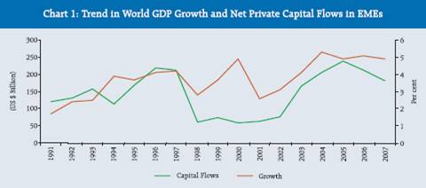Indian trade has grown faster with these countries than its overall trade growth. Emerging Asian economies accounted for a significant share of around 25 per cent in India’s total exports in 2005-06 (16.0 per cent in 1999-2000) and 23.0 per cent of total India’s imports (16.2 per cent in 1999-2000). China has emerged the second major export destination for India after the US. It has now become the largest source of imports for India, surpassing the US. A similar trend was noticeable vis-à-vis the ASEAN-5 (Singapore, Thailand, Malaysia, Indonesia and the Philippines) but way ahead there is vast scope for expanded trade with these countries. In view of this diversified destination and source of India’s foreign trade, it is unlikely that global slowdown would have any significant impact of trade. Moreover, the export basket of India has become increasingly diversified with certain sectors such as automobiles, pharmaceuticals, textiles, etc., and emerging as driving factor. For example, steel production in India is now among the lowest cost in the world. Pharmaceutical and biotech firms are likewise very competitive internationally. It is important to realise that the traditional face of Indian business has changed dramatically in the last few years. Indian firms are no longer only seekers of foreign technology or producer of staple goods or providers of low-end services. Indian corporate sector have recorded better bottom-line growth with higher sales in recent quarters. Their engagement with the world has acquired new dimensions. Indian firms are increasingly carrying out their own R&D. India has an impressive record when it comes to investment abroad and acquiring brands by its companies. Indian firms are acquiring manufacturing firms abroad to leverage comparative advantage of foreign locations, using synergies between the parent company and the company under acquisition and having production facilities near the major markets. Our patent law is compatible with the best countries in the world. The Indian capital market have been exhibiting buoyancy as resources raised by the Indian corporates through public offerings, private placements and euro issues increased significant. The secondary market registered sharp gains during 2005-06 and continued to surge during the early part of 2006-07 with the benchmark indices recording all time high levels. This trend has continued in the current financial year as domestic stock markets recorded gains during the July-September period offsetting almost all the losses suffered in the meltdown in May-June. Large investments by foreign institutional investors (FIIs) and domestic mutual funds on the back of robust macroeconomic fundamentals, congenial investment climate and strong corporate profitability buoyed the stock markets. In the context of impact of slowdown in the US economy which may have adverse impact on the global economy, it may also happen that in search of low cost, outsourcing from the US and other parts of the globe to India may get boost and compensate any adverse effect which may be in terms of slowdown in software exports or remittances. As in recent years, we have witnessed the coming of age of the Indian IT multinationals, with the traditionally India-centric, indigenous players beginning to build noticeable presence in other locations - through cross-border acquisitions, onshore contract wins and organic growth in other low-cost locations. This has been complemented by global majors continuing to significantly improve their offshore delivery capabilities - predominantly in India, vindicating the success of the global delivery model and highlighting India’s increasingly important role in the new world IT order. With Indian firms exporting services ranging from call centers to medical diagnostics to tutoring, India’s position of strength in information technology is well known. India‘s Information Technology Enabled Services/Business Process Outsourcing (ITES-BPO) industry has demonstrated its sustained cost advantage and fundamental competitiveness. Around 30 per cent annual growth in India’s IT and ITES exports since the mid-1990s reflects the maturity of the Indian service capabilities in meeting the needs of a global customer base and the importance accorded to India as a global sourcing destination. According to NASSCOM (2006), IT software and services exports were US$ 23.4 billion in 2005-06. The large investments of the Government in establishing high quality institutions like the Indian Institutes of Technology (IITs), Indian Institutes of Management (IIMs) and other publicly funded engineering and technical institutions form the human resource backbone of India’s IT and ITES revolution. There had been apprehension in several quarters that with the turn in the interest rate cycle after reaching the minimum of 1 per cent, would lead to slowdown in capital flows towards emerging market economies. Moreover, a moderate degree of correlation has been observed in global growth and net private capital flows in emerging market economies in recent years (Chart 1). Any slowdown may have a concomitant impact on the capital flows to emerging economies. However, the events in the last 2-3 years have shown that India has emerged as a major destination of foreign investment, especially portfolio investments even in this tightening cycle. Furthermore, the trend in foreign capital flows in India would also depend on the trend in interest rate differential between India vis-à-vis other countries mainly source countries. It may happen that with the decrease in Fed rate as is expected in US, emerging markets like India may continue to attract private investors from abroad.