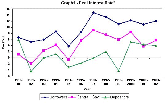On the other hand, lending rates of banks have not come down as much. While banks have reduced their prime lending rates (PLRs) to some extent and are also extending sub-PLR loans, effective lending rates continue to remain high (Table 1 and Graph 1). It is estimated that the average lending rate of scheduled commercial banks has declined from a peak of about 17 per cent in 1995-96 to about 14 per cent by 2001-02. Hence, while nominal interest rates have come down, they have not fallen as much as the inflation rate. Consequently, the effective real lending rate continues to remain high. This development has adverse systemic implications, especially in a country like India where interest cost as a proportion of sales of corporates are much higher as compared to many emerging economies.