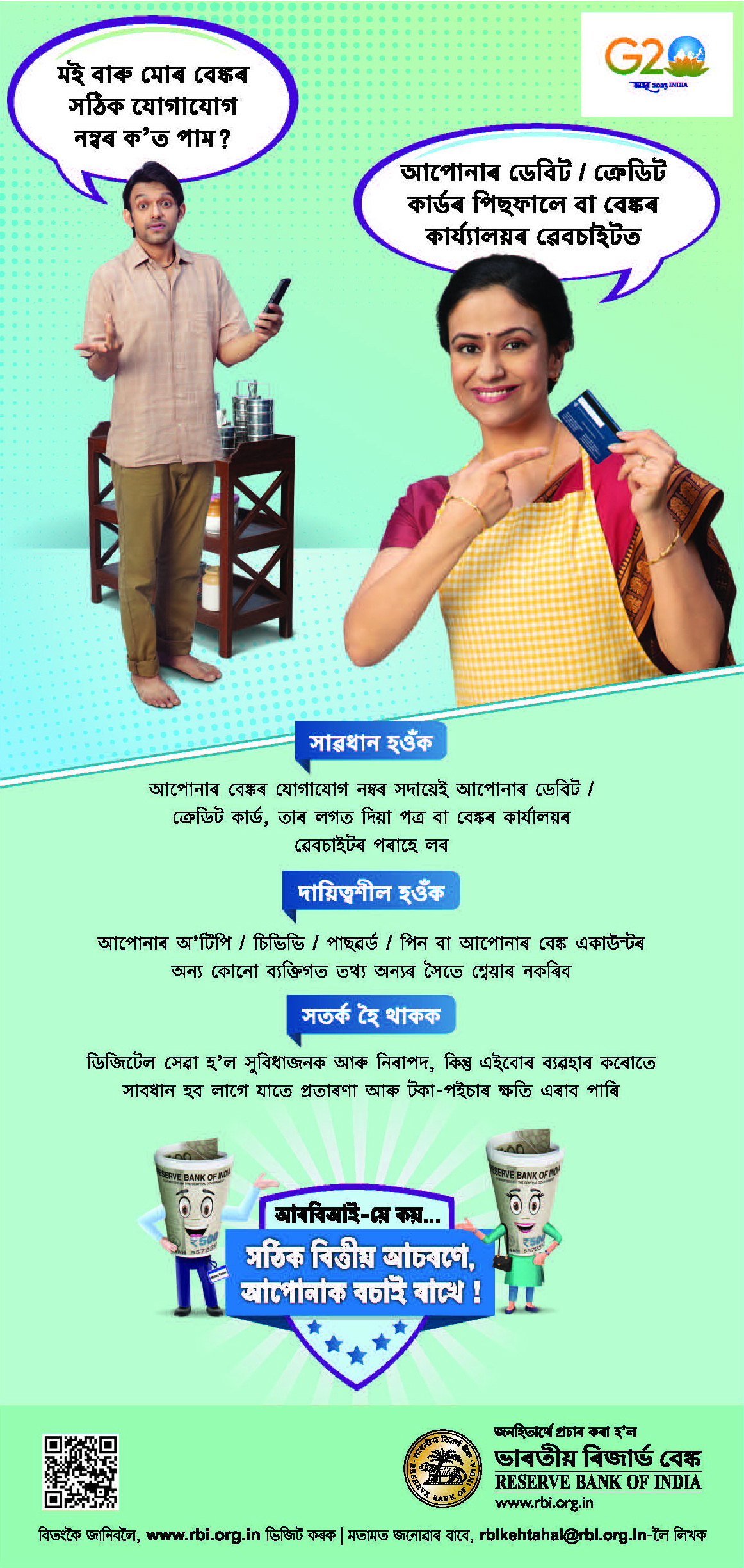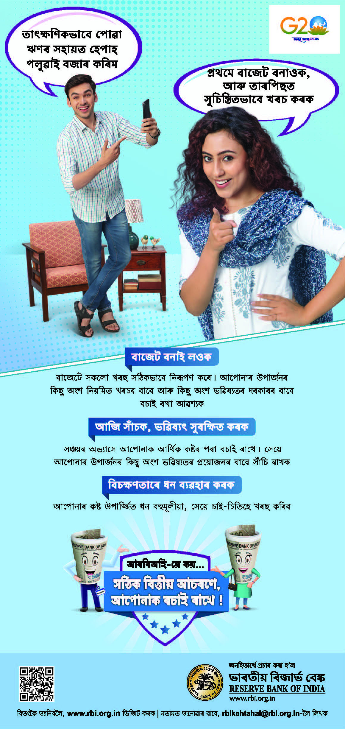 ভাৰতীয় ৰিজাৰ্ভ বেংকে সাধাৰণ ৰাইজৰ মাজত মৌলিক বিত্তীয় সাক্ষৰতা বাৰ্তা প্ৰদান কৰাৰ লক্ষ্য আগত ৰাখি এফএএমই (বিত্তীয় সজাগতা বাৰ্তাসমূহ) পুস্তিকাৰ তৃতীয় সংস্কৰণ মুকলি কৰিছে । পুস্তিকাত বিশটা প্ৰতিষ্ঠান/সামগ্ৰী নিৰপেক্ষ বিত্তীয় সজাগতা বাৰ্তা আছে যিয়ে চাৰিটা মূল দিশ্, বিত্তীয় সামৰ্থ্য, প্ৰাথমিক/ মৌলিক বেংকিং, ডিজিটেল বিত্তীয় সাক্ষৰতা আৰু উপভোক্তা সুৰক্ষাৰ ওপৰত বাৰ্তা প্ৰচাৰ কৰিব ।