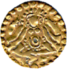 Post-Gupta coinage (6th-12th centuries AD), is represented by a monotonous and aesthetically less interesting series of dynastic issues including those of Harsha (7th century AD, Kalachuri of Tripuri (11th century AD) and early medieval Rajputs (9th-12th centuries AD). Gold coins struck between this period are rare. These were revived by Gangeyadeva the Kalachuri ruler who issued the 'Seated Lakshmi Coins' which were copied by later rulers both in gold as well as in debase form. The Bull & Horseman type of coins were the most common motif appearing on coins struck by the Rajput clans. In western India, imported coins like the Byzantine solidi were often used reflecting trade with the Eastern Roman Empire.