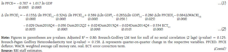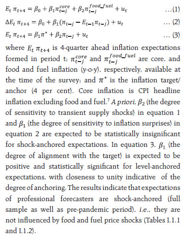 The salary outgo for the manufacturing, services and infrastructure firms polled in Reserve Bank’s enterprise surveys15 reported an increase in Q3:2021-22. For manufacturing firms, the pace of increase moderated in Q4:2021-22 and expected to pick up again in Q1:2022-23, but in the case of services and infrastructure firms, it is expected to moderate in Q1:2022-23. Input cost pressures remained elevated for manufacturing, services and infrastructure firms during Q3 and Q4:2021-22. During Q1:2022-23, manufacturing input costs are expected to remain elevated while some moderation in pace of increase may occur for services and infrastructure firms. Manufacturing firms may charge higher selling prices in Q1:2022-23, vis-à-vis their services and infrastructure sector counterparts (Chart II.22). One year ahead business inflation expectations16 polled by the Indian Institute of Management, Ahmedabad, rose sequentially, crossing 6 per cent in February 2022. The businesses polled in the survey reported further heightening of cost pressures, which along with weak demand conditions impacted profit margins of the sampled firms. ![]() Recent geopolitical events have accentuated upside risks to inflation. Global supply shocks are still unfolding and their ambit across commodities is widening. Input costs, including energy costs, for various manufacturing goods and services are also likely to go up. The impact of recent events will also be conditioned by the outlook for aggregate demand going forward. Persistent commodity price pressures along with the resurgence of global supply chain and logistics disruptions pose risk of their pass-through to domestic inflation. Though the pass-through so far has been limited due to weak demand conditions, going forward it may need to be monitored carefully. The headroom available for supply side measures remain critical to limit the extent of transmission of adverse cost conditions onto retail prices of goods and services. _______________________________________________________________________________________________ 1 Headline inflation is measured by year-on-year changes in the all-India consumer price index (CPI) produced by the National Statistical Office (NSO). 2 Core CPI, i.e., CPI excluding food and fuel is worked out by eliminating the groups ‘food and beverages’ and ‘fuel and light’ from the headline CPI. 3 Retail selling price (RSP) for petrol was at ₹ 110.76 per litre on November 2, 2021 and for diesel, the RSP was at ₹ 102.30 per litre on November 1, 2021, based on the average RSPs of Indian Oil Corporation Limited (IOCL) in the four major metros (Delhi, Kolkata, Mumbai and Chennai). 4 A change in CPI year-on-year (y-o-y) inflation between any two months is the difference between the current month-on-month (m-o-m) change in the price index (momentum) and the m-o-m change in the price index 12 months earlier (base effect). For more details, see Box I.1 of the MPR, September 2014. 5 The CPI diffusion index, a measure of dispersion of price changes, categorises items in the CPI basket according to whether their prices have risen, remained stagnant or fallen over the previous month. A reading above 50 for the diffusion index signals a broad expansion or generalisation of price increases and a reading below 50 signals broad-based price decline. 6 Historical decomposition estimates the contribution of each shock to the movements in inflation over the sample period (Q4:2010-11 to Q4:2021-22) based on a vector autoregression (VAR) with the following variables (represented as the vector Yt) – crude oil prices; exchange rate (INR per US$), asset price (BSE Sensex), CPI; the output gap; rural wages; the policy repo rate; and money supply (M3). All variables other than policy repo rate are growth rates. The VAR can be written in reduced form as: Yt =c + A Yt-1 + et; where et represents a vector of shocks. Using Wold decomposition, Yt can be represented as a function of its deterministic trend and sum of all the shocks et. This formulation facilitates decomposition of the deviation of inflation from its deterministic trend into the sum of contributions from various shocks. 7 The CPI weighting diagrams use the modified mixed reference period (MMRP) data based on the 2011-12 Consumer Expenditure Survey conducted by the National Sample Survey Office (NSSO). Under MMRP, data are collected on expenditure incurred for frequently purchased items – edible oil, eggs, fish, meat, vegetables, fruits, spices, beverages, processed foods, pan, tobacco and intoxicants – during the last seven days; for clothing, bedding, footwear, education, medical (institutional), durable goods, during the last 365 days; and for all other food, fuel and light, miscellaneous goods and services including non-institutional medical services, rents and taxes, data relate to the last 30 days. 8 Item level retail and wholesale prices are aggregated at respective subgroup using item level CPI weights. Data for January-March 2021 have been excluded due to changes in price collection mechanism and item varieties by DCA. 9 The inflation prints of April and May 2020 were not available due to country-wide lockdown. 10 WPI Non-Food Manufactured Products. 11 Studies in the US have successfully used PMI price indices, along with other variables, to forecast inflation (Banerjee and Marcellino, 2006; and Wright, 2008). 12 The null of no causality is rejected for PMI input prices to output prices and input prices to core CPI at 5 per cent level of significance. While for the former it holds from first lag to higher lags of input prices, significance reduces for higher lags for input prices to core CPI. 13 The results of unit root tests indicate that while the null hypothesis of the presence of unit root is rejected for PMI Composite input and output price series making them I(0) variables, it is not rejected for core CPI making it an I(1) variable. Accordingly, OLS is adopted for PMI input to ou