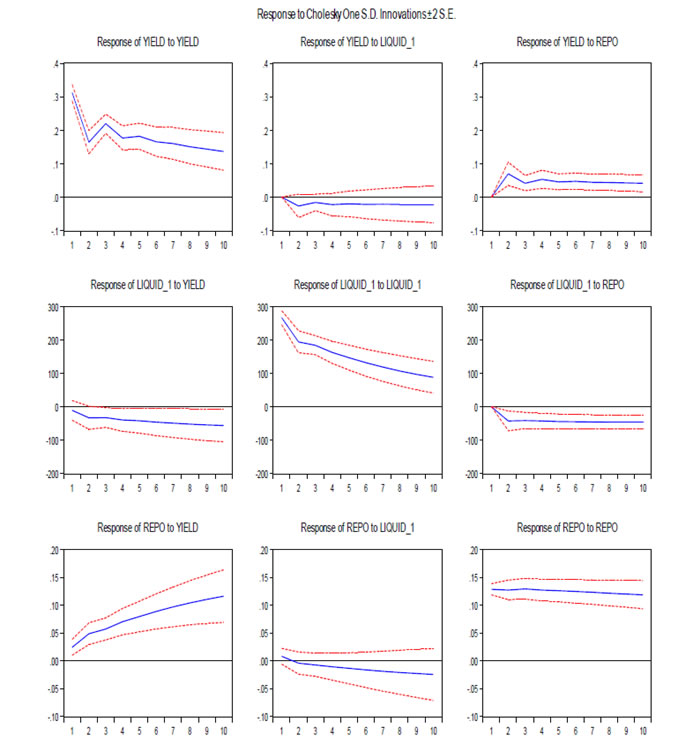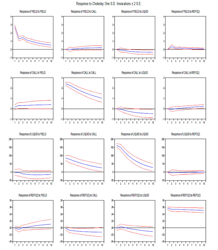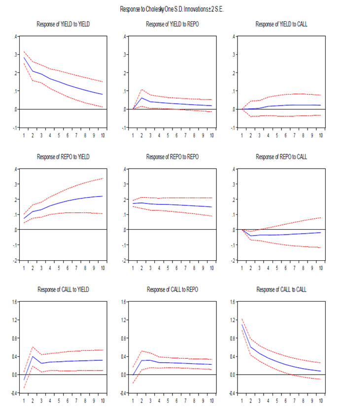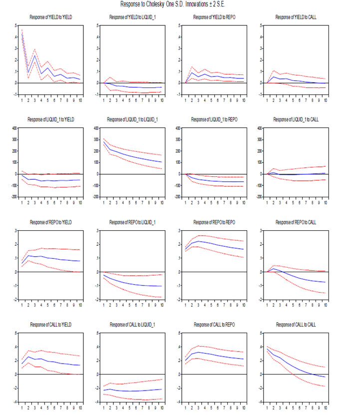 Data Auction-wise data on maturity, amount raised, weighted average yield, availability of net liquidity on those days of auction, repo rate, MSF rate and weighted average call rate on those days have been used for the period from November 2008 to February 2014.All these data have been adopted from the Handbook of Statistics on Indian Economy and the press releases of the RBI. Methodology ![]() ![]() While perusing the literature, it is observed that there is much more common to report functions of the VAR coefficients which are more informative, and have some economic interpretations. Further, the process of choosing the maximum lag p in the VAR model requires special attention because inference is dependent on correctness of the selected lag order. Therefore, studies generally estimate (i) impulse response function, (ii) forecast error variance decompositions and (iii) historical decompositions. Further, it is much more common to report the IRF under VAR framework, which assess the relative contribution of different shocks to fluctuations in variables. Generally, IRF traces the effect of a one-time shock to one of the innovations on current and future values of the endogenous variables. This is normally done with MA(∞) representation of the VAR model. However, the major assumption is that the shocks are independent. We have estimated the IRF under unrestricted VAR framework to assess the response of the yield to sudden shocks or innovation to the system liquidity and the cost of such liquidity, i.e., net system liquidity, repo rate, MSF rate and weighted average call rate. Normality tests are often used for model checking, although normality is not a necessary condition for the validity of the VAR model. However, non-normality of the residuals may indicate other model deficiencies such as nonlinearities or structural changes (Helmut, 2011). Therefore, before estimating the VAR, it would be more appropriate to test the statistical properties of the data used in the empirical analysis. The unit root test has been attempted to ascertain the stationarity of the series. The unit root test reveals that the amount of auction and the residual maturity of the securities are stationary at levels [I(O) series] while other variables are stationary at their first difference [I(1) series] (Table 5). The results are statistically significant at 1 per cent level. While the variables used in the VAR are stationary in their first difference, it means that they are integrated with order I(1). Results As per IRF estimation under the condition of cholesky degrees of freedom adjusted, in case system liquidity is in deficit phase, when a positive shock is given to the net availability of liquidity, the bond yield gradually moves to the reverse direction in the first four period (four weeks) and thereafter, the yield stabilizes at a level lower than the level before the shock is effected (Annex 1). In this scenario, while a shock to repo rate does not stimulate the yield movements much, however, expected increase in repo rate has immediate positive impact on the yield, which increases immediately and thereafter it reverts and stabilizes at the earlier level. The call rate responds positively and the yield increases slowly and stabilizes at an elevated level. In times of surplus liquidity phase, an innovation in liquidity does not impact the yield movement much as the system is already flooded with liquidity. In such a situation, a shock to repo rate has little impact on the yield. However, expected increase in call rate impact the yield significantly and thereafter stabilizes at the earlier level (Annex 2). To study the impact on the yield of different maturities of G-Secs in the primary auctions, the data for the period from November 2008 to February 2014 were segregated according to the residual maturity in three groups, viz., (i) upto 10 years, (ii) above 10 years and upto 20 years and (iii) above 20 years. While estimating the IRF, shocks to the liquidity, repo and call rates impact the bond yield at the desired direction in the maturity bucket of 10-20 years securities whereas yield of securities upto 10 year maturity is impacted by the shock of liquidity and repo rate. Securities having residual maturity of above 20 years, the impact on the yield is significantly low when a shock to the liquidity is effected. This may be due to the fact that the interest on long term investments are being decided mainly by inflation expectations, interest rate scenario and the long term cost of funds. The repo rate has impacted the yield of the G-Secs significantly with all maturities upto 30 years. In case of securities with maturities above 20 years, a shock to call rate impacts the yield after two weeks. In all the three categories of maturity, when a shock is given to the repo rate, the yield responds positively and increases immediately and thereafter stabilizes above the level of the pre-shock period (Annex 3, 4 & 5). It needs to be mentioned that the repo rate has been used as lead indicator, which has direct impact on the yield of the bond. In addition to repo rate shock, expectation of increase in repo rate also impulse the yield to increase and the same is the case with the call rate. However, when the market expects a decrease in call rate, bond yield for shorter maturities has decreased in anticipation. This was evidenced during 2014 when the market was speculating such a decline in call rate as a consequence of reduction in repo rate. When the IRF is estimated with combined liquidity phase (deficit and surplus), the yield does not respond to positive shocks in liquidity. However, the yield responds positively to shocks in marginal standing facility and repo rates. Accordingly, when the rates of repo and MSF are increased, the yield also tends to increase simultaneously. The variance decomposition provides information about the relative importance of each random innovation in affecting the variables in the