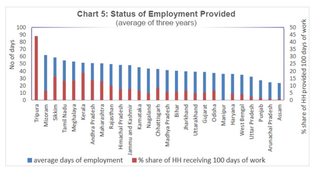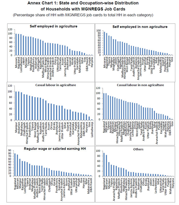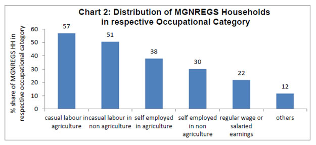 While MGNREGS is introduced in 96 per cent of districts in India, it does not automatically ensure full implementation. As against the stipulated 100 days of employment per household, only less than 10 per cent are given 100 days of employment at the all-India level. On the other hand, in Kerala, more than 20 per cent of households have received the 100 days of employment during 2012-13 and 2013-14. Thus, even though it is introduced in majority of districts, its implementation differs across states and districts. Accordingly, the effect of MGNREGS will also be different based on the level of implementation. The data given in MGNREGS site relates only to MGNREGS households. However, for analyzing the effectiveness of the programme, wider details are required including the number of rural households in each state and their occupational and income classification as MGNREGS is targeted more on the casual labour category. Hence, for investigating the effectiveness of the programme, NSSO unit level data is analysed. 3.2: Effectiveness of MGNREGS - A State-wise Analysis In this sub section, NSSO unit level data on Employment and Unemployment Survey (68th Round) is examined for measuring effectiveness of MGNREGS3. The data pertains to the time period July 2011 to June 2012. As pointed out in Section 1, Schedule 10 of the Survey includes questions on MGNREGS like whether the household has got MGNREGS card and whether worked in MGNREGS during the last 365 days. Using these data the effectiveness of MGNREGS in each state is examined. Effectiveness can be analyzed at two levels; (1) in terms of number of households (HH) having MGNREGS job card and (2) whether the HH having job card have actually got work. While the former measures effectiveness in coverage, the latter measure effectiveness in implementation. Thus, in this scheme effectiveness of the scheme is looked at the limited perspective of providing job card as well as employment. Hence, issues like quality of work and asset created is outside the purview of this study. A state can be ineffective at the first level itself whereby only a limited number are offered job card. By its design MGNREGS is more applicable to casual labour and agriculture income household where income flow is not continuous. Within the agricultural income households, it is more applicable to small and medium farmers and hence analysis is made after eliminating households having land above 5 hectares. Our analysis on NSSO data supports the above assumption and reveals that majority of MGNREGS households belongs to casual labour households and agricultural households (Chart 1). Similarly, more than half of the casual labour households in India have got MGNREGS job card (Chart 2). For example 57 per cent of casual labour in agriculture and 51 per cent of casual labour in non-agriculture households have MGNREGS job card. While their share is higher than the other categories, it throws light to fact that almost half of the casual labour households have still not even applied for job card. While there may be some element of voluntary exclusion in this, it underlines the need of increasing its coverage. Further, there may be inter-state disparities in implementation of the scheme which also needs to be addressed. A state-wise analysis of MGNREGS implementation reveals wide difference in the coverage of MGNREGS (Chart 3). In general, North Eastern states, Chhattisgarh, Uttaranchal, Rajasthan, Jammu and Kashmir and Himachal Pradesh, were more effective in providing MGNREGS job card. On the other hand, Haryana, Punjab and Maharashtra are the worst performers among the major states. Among the various occupational categories, casual labour households were having more MGNREGS job card holders compared to other job categories (Annex Chart 1). The above analysis shows that there is wide differences in coverage of MGNREGA across states. Next, the status of implementation of MGNREGA across States is looked at. As pointed out above, a state can be effective in implementing MGNREGS only if they could provide job for those who have sought work. For analyzing this, the individuals who have registered for the MGNREGS job card is first identified and then examined their job status. Under job status the data provides three alternatives, viz, (1) worked under MGNREGS (2) sought but did not get work and (3) did not seek work. Among the three categories only the second can be taken as signal of ineffectiveness as the third is voluntary in nature. If at least one individual in a household have received job under the scheme, then that household is treated as covered. Accordingly, Chart 4 provides the state-wise ineffectiveness. Maharashtra ranks top in ineffectiveness measured in terms of percentage share of individuals who have sought but did not get work to total number of individuals having job card. Among the households with MGNREGS job card, 57 per cent have sought work under MGNREGS and were not able to get work in Maharashtra. On the other hand, North Eastern states and Southern States like Kerala and Tamil Nadu were more effective in providing work for those having job card. Taken together, it can be concluded that North Eastern states and Chhattisgarh are the most effective in implementing MGNREGS in both counts. States like Tamil Nadu, Kerala and Jammu Kashmir also performed well in terms of providing job for the job card holders, though in coverage their performance is low. Haryana, on the other hand, though came in the top group in terms of work provided, performed dismally when the coverage was considered. Out of the total rural household with land below 5 hectares and also excluding the regular salaried and wage class, Haryana could provide job card only for a meager 7 per cent. Hence, even though it came top in terms of job provided, it cannot be considered as a high performer. On the other hand, Maharashtra, Bihar, Gujarat and Karnataka were the worst performers in both counts (Tab