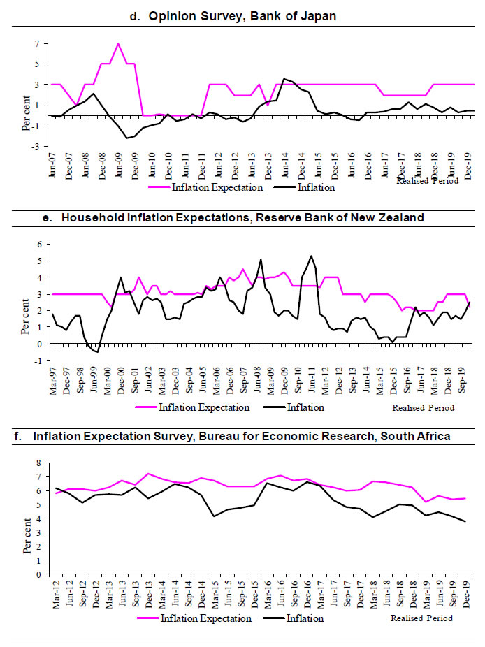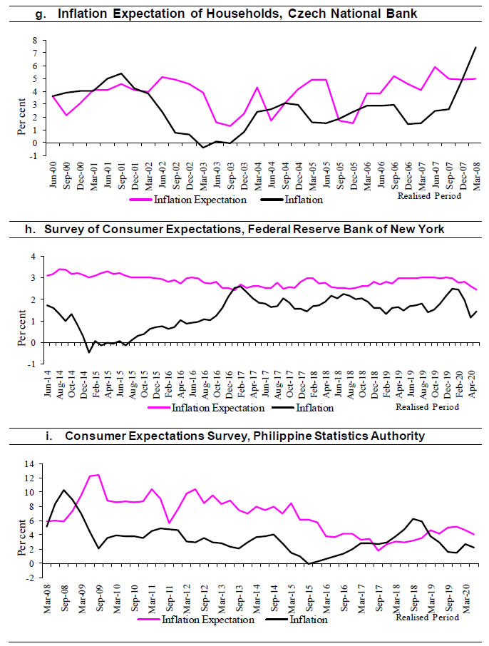 A look at the gap between inflation expectations and the CPIU inflation (in the above mentioned five major phases of the inflation history) in Table 5 reveals that all the measures displayed a relatively low gap during the ‘very high inflation’ and the ‘moderating inflation’ periods, which then widened during the ‘low inflation’ period. Only in the ‘stable inflation’ period, the gap has narrowed which indicates the sticky nature of the households’ inflation expectations. In other words, households take their time to anchor their expectations about future inflation. Further, the forecast errors are unsystematic in ‘very high inflation’ period on the back of low bias, and later the errors remain systematic (Table 6).
