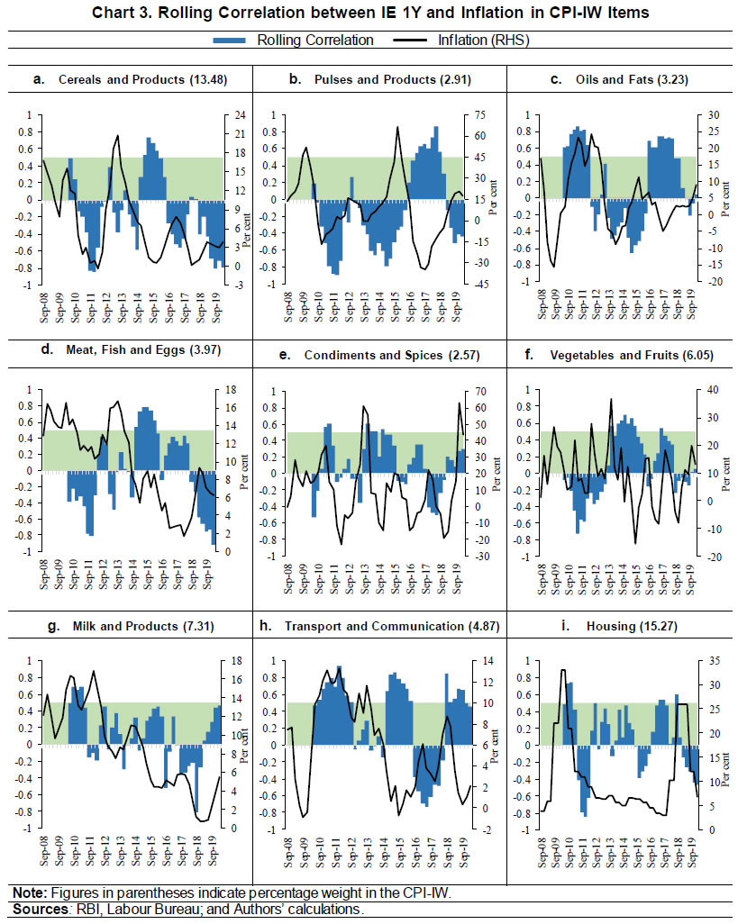 At this point, it is necessary to investigate the reason for this gap between households’ inflation expectations and actual inflation, for which main factors influencing households’ inflation expectations are required to be identified. In the following paragraphs, qualitative (directional) responses on price and inflation expectations for one year ahead horizon have been used to find out the commodity groups which trigger the formation of expectations. The response options for qualitative questions on the expected direction of prices and inflation for three months ahead and one year ahead horizons are, ‘Prices will increase (PI)’, ‘Price increase more than current rate (PIMCR)’, ‘Price increase similar to current rate (PISCR)’, ‘Price increase less than current rate (PILCR)’, ‘No change in prices (NCP)’ and ‘Decline in prices (DP)’. A cross-tabulation of these responses for the ‘General Products’ vis-à-vis another product group say ‘P’ (either of Food Products/ Non-Food Commodities/ Household Durables/ Cost of Housing/ Cost of Services), can be shown as follows: ![]() The diagonal elements represent the frequency of similar responses for General Products and product ‘P’ and the share of all diagonal elements (out of the total sample size n) D, as given in equation (4), indicates the degree of similarity between the responses for ‘General Products’ and those for ‘P’; higher the value of D, the higher is the similarity. For responses relating to each of the product groups, the χ2 statistic for dependence between responses on General Products and the product group has been computed using equation (5). The χ2 statistic calculates the relative deviation of each of the frequency cells from an expected value of that cell under the null of independence of the responses of General Products and ‘P’. Hence, the higher the value of χ2, stronger is the dependence between responses on General Products and those on ‘P’. In order to test for the null of independence, these computed statistic values are to be compared with the upper 0.05-point of the χ20.05,(5−1)(5−1) distribution; if χ2 > χ20.05,(5−1)(5−1), then the null of independence is rejected at the 5 per cent level of significance. Although, the test has been rejected for the one year ahead expectations on each of the product groups in all the survey rounds, still the tabulated χ2 statistic value can be used to check the degree of dependence as is shown by a heat map in Table 8. Over the rounds, inflation expectations have been mostly affected by the future sentiments on prices and inflation in food products followed by non-food products. However, recently, expectations on cost of services are also influencing the formation of expectations about the general prices and inflation. ![]() ![]() Since inflation expectations are mainly affected by the sentiments on food products, a question may arise as to whether they are able to forecast food inflation. To answer this, it is necessary to identify the food item(s) which households consider while forming their inflation expectations. For this, 8-quarter rolling correlations between the mean value inflation expectations for one year ahead (1Y IE) and CPI-IW3-based inflation for common food items, ‘housing’, and ‘transport and communication’ sub-groups, are computed and plotted in Chart 3. A rolling correlation above 0.5 is considered here as an indicator of high relation between inflation expectations and the item. This analysis was repeated to study rolling correlations between (i) one year ahead net responses4 on inflation expectations for food products (1Y Food NR) and CPIIW inflation in various food groups; (ii) one year ahead net responses on inflation expectations for non-food products5 (1Y Non-Food NR) and CPI-IW inflation in ‘transport and communication’; and (iii) one year ahead net responses on inflation expectations for housing (1Y Housing NR) and CPI-IW inflation in ‘housing’ (Chart A1, Annexure). The CPI-IW product groups bearing a high rolling correlation with the future inflation sentiments captured by the IESH are summarised for both the above analyses in Table A3, Annexure. It can be observed that while all the highly positive correlation values are either preceded or accompanied by a hike in inflation of some items, none of the items shows a consistent highly positive relationship with the inflation expectations in the study period. The high negative correlations encountered are due to the fact that the inflation expectations were being influenced (positively) by some other item(s), during those periods. From the findings in Table A3 in Annexure, it is clear that while inflation expectations were mostly driven by ‘oils and fats’, ‘vegetables and fruits’ and ‘transport and communication’ during the ‘very high inflation’ period (December 2009 to June 2013), more items viz., ‘cereals and products’, ‘meat, fish and eggs’, ‘vegetables and fruits’ and ‘transport and communication’ influenced them during the combined period of ‘moderating inflation’ and ‘low inflation’ (September 2013 to September 2016). On the other hand, future inflation sentiments were impacted by ‘pulses and products’, ‘oils and fats’ and ‘transport and communication’ in the ‘stable inflation’ period (December 2016 onwards). Hence, it may be safely concluded that inflation expectations at different time points get influenced by different items in the consumers’ consumption baskets ![]() An item having relatively low weight in the CPI basket may have a disproportionate influence on households’ inflation expectations, if it constitutes a major portion of the households’ baskets, e.g., the sub-groups like ‘pulses and products’, ‘condiments and spices’, etc. Further, households’ expectations about future inflation also vary widely across the geography. A dissimilarity 