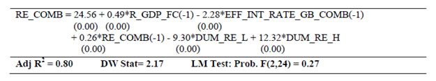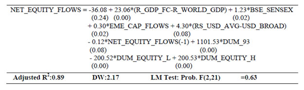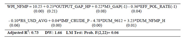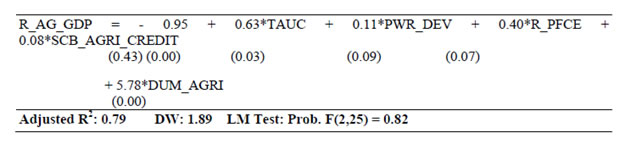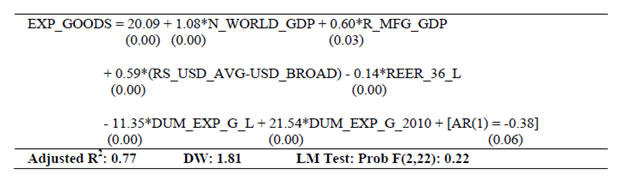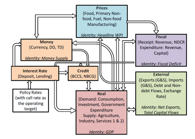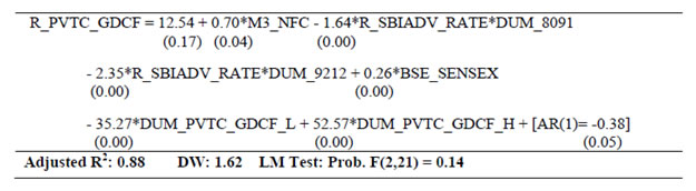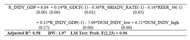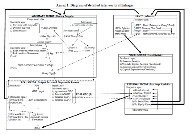 | RBI Working Paper Series No. 03 Abstract 1The paper develops a series of structural equations outlining relations within and across sectors of the macro-economy in India. The economy is conceived as a network of five sectors, the output (GDP and its components), prices (WPI and its components), monetary (money supply and interest rates), government finance (government expenditure and receipts) and the external sector (trade, capital flows and exchange rate). Estimations are made over 1980-81 to 2012-13 with annual data and at disaggregated levels so as to provide a clear idea about inter-linkages and channels of policy transmission in India. The emphasis is to understand the evolving economic structures in India over a long period of time. Variables are mostly in growth form (annual percentage change) and stationary that make it a useful framework of policy inferences. Equations are estimated using ordinary least squares with dummies taking into account regime changes and other known events. Using equations for forecasting may not be advisable as they reflect average relation over a long period of time with structural breaks. This can nevertheless be useful as preliminary work for a macro-model in India. JEL Classifications: E1; E2; E3; E4 Keywords: India; Macro-aggregates; Sectoral Dynamics; Inter-sectoral Linkages Section I: Introduction Empirical research to back macro-model in India is limited. The prominence of research for forward looking economic assessment including model building and policy simulation is now emphasised and institutionalised within the RBI. In this context, this paper estimates a set of structural equations so as to enable further work on macro-model in India for its use in monetary policy. The paper is arranged as follows. Section II outlines motivation of the study. A brief overview of structural linkages is presented in Section III. Estimation details are given in Section IV. Concluding observations are made in Section V. Section II: Motivation for this Study Econometric models covering sub-sectors of the Indian economy date back to the mid-1950s. Earlier models (until 1960s) confront with data problems [Narasimham (1956), Krishnamurty (1964)]. As more data are available, models become disaggregated (in the 1970s) with added focus on policy analysis [Pandit (1973), Pani(1977) and Chakrabarty (1977)]. Models of the 1980s step up policy focus further. P.K. Pani (1984) analyzes structural equations for output, demand, fiscal operations, money supply and prices. Chakrabarty (1987) establishes linkages among real, fiscal, monetary and external sectors over 1962-63 to 1983-84. Rangarajan, Basu and Jadhav (1989) examine interaction between government deficit and debt. Rangarajan and Singh (1984) analyze reserve money multiplier. Pradhan, Ratha and Sharma (1990) explore the interaction between the public and the private sector. The models in the 1990s address more complex issues in the wake of economic reforms [Chakrabarty and Joshi (1994), Rangarajan and Mohanty (1997) and Klein and Palanivel (1999)]. Rangarajan and Arif (1990) ascertain differential impacts of monetary expansion on output and prices in a state of less than full employment. Rangarajan and Mohanty (1997) focus on macroeconomic impacts of fiscal deficit. Besides individual attempts, there are institutional attempts to build and maintain comprehensive models for policy analysis and generating forecasts. Economic and financial integration with the global economy become an important channel of disturbance for the Indian economy over the last two decades. Accordingly, a need for econometric model arises linking all the important sectors of the Indian economy (Krishnamurty, 2002). Singh (2005) designs an econometric model covering 1985–1986 to 2001–2002. Patra and Kapur (2010) use a New-Keynesian framework to understand inflation. None of these models however deals with the rapid institutional and structural changes in the Indian economy. Econometric models are also undermined by the lack of comprehensive and consistent database in India. Monetary policy making within the RBI pursues various ad-hoc modelling efforts for forward looking assessment including the risks to growth and inflationary outlook. Such initiatives have been increasingly supplemented by more frequently available information like various leading and coincident indicators, company finance data, macro data on real, monetary, financial and fiscal parameters as also various survey results. The technical model based results are generally cross-checked against all other information for an overall consistency. With the RBI moving towards formal and flexible inflationary mandate, econometric modelling requirements are expected to take a more structural economy-wide base. This would call for a greater understanding of the interaction among variables and conducting a more comprehensive assessment of macro-risk scenarios in modelling/forecasting exercise. In this context, a revisit of the macroeconomic linkages within and across sectors is useful. Accordingly, this paper estimates several structural equations on a disaggregated dataset to explore how various sectors across the macro-economy relate within and among themselves, the importance of variables in explaining others and the ways their impact is likely to percolate through the overall economic structure in India. Although the larger aim is to fill the existing gap of econometric modelling in India, the approach here is to use a simple and flexible estimation framework, while capturing all important information. It is expected to aid in an understanding of all the major sub-sectors and create a base for further research and more sophisticated analysis on the macro-economic outlook in the future. Section III: A Brief Overview of the Structural Linkages A set of equations are estimated to explore linkages amongst important macroeconomic variables across: (i) Monetary, (ii) Prices, (iii) Re
