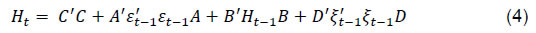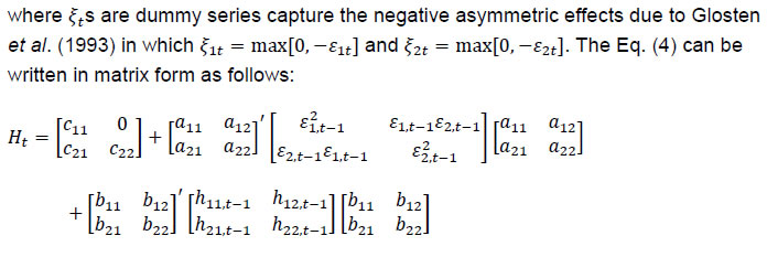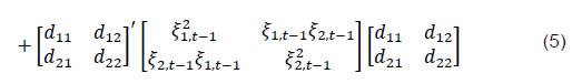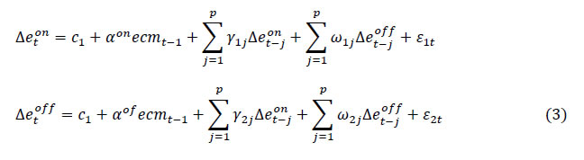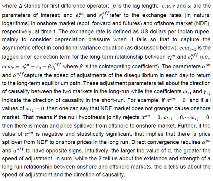 V.I. VECM-MGARCH Framework A two-step procedure is followed to examine the relationship between onshore and offshore exchange rates of the Indian rupee. First, a vector error correction model (VECM) is used to study the long-run and short-run dynamics of the two markets. In the second step, a bivariate BEKK-GARCH (1,1) model, as proposed by Engle and Kroner (1995), is estimated. Our choice for using BEKK-GARCH model was prompted by its advantage over other multivariate conditional volatility models in ensuring positive definitiveness. In the model, the system of conditional mean equations follow from the VECM specification as given in eq. (3) and conditional variance equation as in eq.(4). ![]() ![]() From eq. (3), we get residuals, ε1t and ε2t, which are then used in the second stage to estimate the variance and co-variance equations. Taking into account the asymmetric responses, i.e., volatility tends to increase more in response to negative shocks (bad news or large depreciations of the rupee) than positive shocks (good news or appreciations), in the variances and covariances, as proposed by Kroner and Ng (1998), a BEKK representation of conditional variance equation can be written as: ![]() ![]() ![]() In the above model, the dynamic process of Ht is a linear function of its own lagged values, lagged squared innovations and the cross-product of the innovations, and asymmetric terms. Volatility transmission between onshore and offshore markets is represented by the off-diagonal parameters in matrices A and B while the diagonal parameters in those matrices capture the effects of their own past shocks and volatility. The diagonal parameters in matrix D measure the response of own past negative shocks while the off-diagonal parameters dij show the response of one market to the negative shocks in another market, called the cross-market asymmetric responses. V.II. Granger Causality Tests The causality in conditional means is tested in exactly the same way as mentioned in the previous sub-section. The only difference here is that the test is performed after simultaneous estimation of eq. (3) and eq. (4) whereas, in the earlier case, the test was conducted after estimating eq. (3) only. Specifically, we test the joint significance of parameters αon and ω1j being different from zero to study mean spillovers from offshore to onshore markets up to the pth lag and vice-versa if αof and ω2j are non-zero. The no-causality in variance test, based on cross-correlation function (CCF) of squared residuals of univariate GARCH model of Cheung and Ng (1996), extended to multivariate framework following Caporale et al. (2002). Tests for causality-in-variance is performed by constraining the matrices A, B and D to be upper triangular and lower triangular, thereby permitting for causality in either direction. The causality-in-variance is checked employing likelihood ratio test for the null hypotheses of no causality-in-variance from offshore to onshore (H0: a12 = b12 = d12 = 0) and no causality-in-variance from onshore to offshore (H0: a21 = b21 = d21 = 0) considering the asymmetric effects. However, d12 and d21 can be dropped from the tests to know the causality without asymmetry response2. VI. Data and Empirical Results Closing prices of USD/INR exchange rates (as per the Indian timestamp in Thomson Reuters Eikon) for the period January 1, 2005 through December 31, 2019 have been used in this paper. The daily exchange rates are spot, forward, futures and NDF of 1-month maturity, and are expressed in natural log forms after converting them to USDs per Indian rupee. Here, the offshore market is represented by the NDF rate whereas the other three exchange rates are onshore rates. Summary statistics of annualised exchange rate returns are displayed in Table 2. Here, data is presented from 2009 through the empirical exercises are conducted using data from 2005-2019. The results show exchange rate depreciation in each year except 2009, 2010 and 2017. The average return in the offshore market is not statistically different from that of the onshore market. However, the volatility in the NDF market is significantly higher than that in onshore segments. The result also reveals a rise in volatility during 2010-2013, which has come down over the years except in 2018. The correlation coefficient of the annualised exchange rate returns is statistically significant and large in size, while the degree of correlation declines during the years of excess volatility. All these results provide preliminary evidence of volatility spillovers from offshore to onshore markets. However, volatility transmission to onshore market might have increased as can be inferred from high volatility during 2013 despite low correlation coefficient on account of lead and lag in relationship and time zone differences. These preliminary results create the need for a deeper analysis of the relationship between onshore and offshore markets. VI.1. Long-run Causality As expected, the exchange rate series are non-stationary in levels but stationary in first differences as per various unit root test results (Table 3)3. This calls for the examination of any stable long-term relationship between onshore exchange rate series and NDF rate using cointegration test. Johansen maximum likelihood estimation result suggests a unique cointegrating relationship between any of the onshore exchange rate series (spot, forward and futures) and NDF rate as suggested by both λtrace and λmax test statistics (Table 4). Although unit root and cointegration test results discussed above are for the full sample period, we also conduct the analysis on five sub-sample periods.4 The estimated long-run and short-run coefficients are reported in Table 5. The result shows that β is positive, statistically significant and with a magnitude very close to or at 1, implying an almost one-for-one movement across markets in the long run. For example, a 1 per cent increase in NDF r