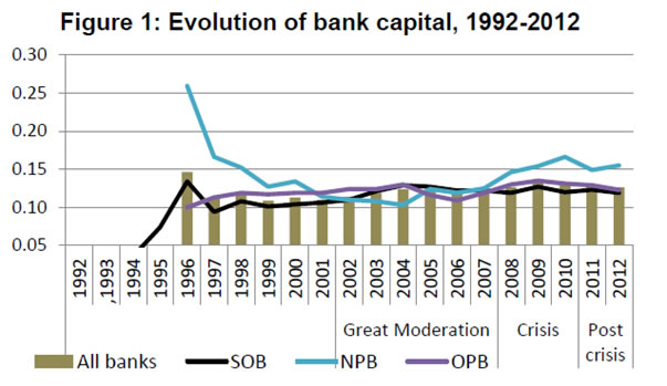 | RBI Working Paper Series No. 06 Abstract 1Employing data for 1992-2012, the article examines the factors affecting the capital structure of publicly listed Indian banks from a corporate finance perspective and compares the findings by exploiting a comparable sample of largest (based on their average market capitalization of last three years) non-financial firms. The analysis indicates that profitability, growth opportunities and risk are the factors that are most relevant in influencing bank capital. Second, the crisis appears to have exerted a perceptible impact on bank capital. On balance, the results do not support the conventional wisdom that banks’ capital structure is purely a response to the regulatory requirements. JEL classification: G 21; D74 Key words: capital structure; Indian banks; non-financial firms; book leverage; market leverage; Ownership Introduction Banks are special primarily because of the highly leveraged nature of their business. Deposits, which is the mainstay of their leverage, is generally insured at least partially but often without commensurate premia. To ameliorate possible moral hazard concerns, regulators prescribe certain minimum capital-to-asset ratio to be maintained by banks at all times. With the introduction of capital standards by the Basel Committee in the late 1980s, such norms have, by and large been adopted universally with suitable country-specific refinements to reflect more accurately banks’ portfolio risk. Thus, according to one view, regulatory standards determine the capital ratios of banks with some cushion above the prescribed minimum to minimize the likelihood of regulatory intervention or the need to raise capital at a short notice. However, empirical evidence since the 1990s bears out that banks hold capital buffer much in excess of regulatory minimum (Van Roy, 2008). This raises a question as to what other factors may affect their capital structure. Such higher capital requirements often come at a cost, though. It has been argued that higher capital requirements for banks might affect their performance. This could occur if banks’ cost of financing were to increase significantly due to more capital holding as opposed to debt. The higher funding costs could result in lower return for banks or an increase in their lending rates (Hellmann et al., 2000; Diamond and Rajan, 2000; Berger and Bouwman, 2013). Theoretically, several reasons have been put forth to justify why banks hold capital in excess of regulatory minimum (Berlin, 2011). One strand of literature contends that the Basel capital requirement is a key factor that drives banks’ capital behaviour. In the models advanced by Allen et al. (2006) and Mehran and Thakor (2011), higher capital promotes better monitoring of loans which, in turn is manifest in higher profits and/or higher market valuation. An alternate line of thinking observes that lower levels of capital might engender excessive risk taking. Anticipating this possibility, debt holders require a premium to finance banks. Consequently, market discipline from debtors compels banks to hold sufficient amount of capital (Calomiris and Kahn, 1991). It is also possible that higher capital level serves as a buffer in the event of a decline in revenues that may prompt a run on banks (Diamond and Rajan, 2000). Yet others state that, notwithstanding the manifold differences, banks may have similar incentives as those of non-financial firms and as a consequence, their capital structure may be guided by the same set of factors. Empirically therefore, it should be possible to test within an appropriate set up which of these factors are more relevant. By way of example, using data on US large bank holding companies during 1986-2001, Flannery and Rangan (2008) document a large increase in bank capital, driven primarily by counterparty (market) risk. Gropp and Heider (2010) report a negative relationship between leverage and asset risk for large publicly traded commercial banks in the US and European Union. Employing data on large banking organizations for 12 advanced economies, Brewer et al. (2008) finds that larger banks have lower capital ratios than smaller ones. Evidence on Turkish commercial banks appears to suggest that size exerts a positive effect whereas profitability exerts a negative effect on book leverage (Caglayan and Sak, 2010). We contribute to this literature by analyzing the determinants of capital structure for Indian banks covering the period 1992-2012 that encompasses the recent financial crisis. To explore whether similar results carry over to non-financial firms, we also report results with a comparable set of variables for these entities. Though we focus primarily on leverage, we address several related issues as well. First, we examine the relevance of bank ownership for leverage. Extant evidence appears to suggest that the capital position of private banks is higher as compared to SOBs. During the period 1992-2012 for instance, the equity-to-asset ratio of private banks was 8.4 as compared to 5.5 for state-owned banks (SOBs)2. Post-crisis, private banks equity-to-asset ratio has improved to 16.9 as compared to 5.6 for SOBs. The equity-to-asset ratio for foreign banks has traditionally been lower, averaging 12.4 during the 1992-2012 period. The literature has focused on several facets of ownership, including its interlinkage with bank performance (Micco et al., 2007), stability (Iannotta et al., 2007, 2013; Beck et al., 2009), efficiency (Altunbas et al., 2001; Das and Ghosh, 2006; Casu et al., 2012), productivity (Kumbhakar and Sarkar, 2003) and risk-taking (Barry et al., 2011). To what extent does ownership matter for leverage has not been adequately explored and this is one of the issues addressed in the paper. Second, we investigate the importance of the recent financial crisis in impacting bank capital. Several studies have examined the behavior of U.S. commercial banks during the crisis (Huang, 2