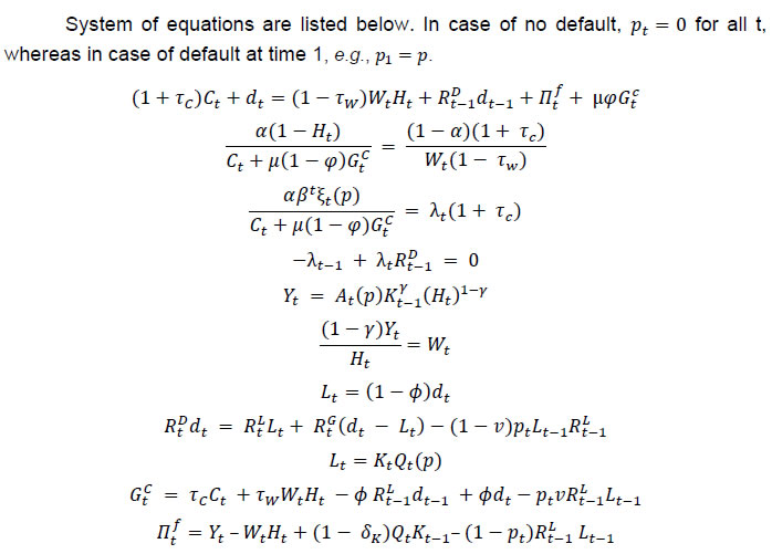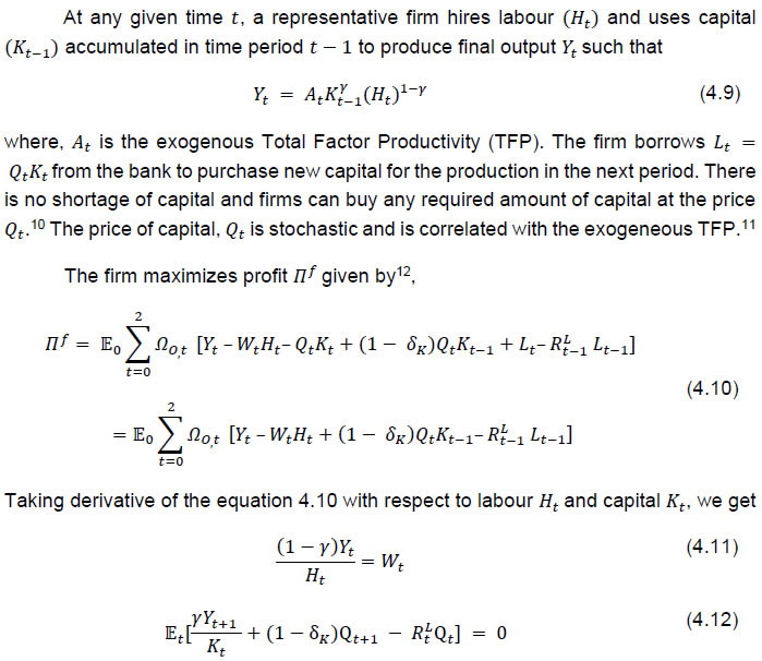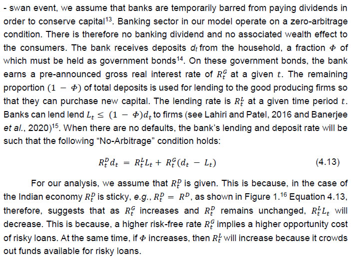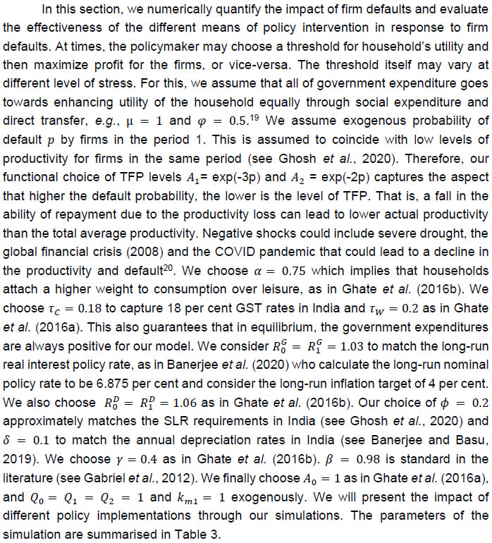 | RBI Working Paper Series No. 06 Saving Banks from a Black Swan: Options and Trade-offs Saurabh Ghosh, Pawan Gopalakrishnan and Abhishek Ranjan@ Abstract 1In this paper, we analyse the best possible policy responses for banks facing a loan default because of an extreme and rare negative productivity shock. We use a finite-period framework with complete information to analyse the impact of such a shock on an economy with sticky deposit rates and bond yields. Our findings indicate that any recapitalisation measure works best in a flexible deposit/ lending rate environment for all alternative saving vehicles, as it leads to better transmission. However, policy interventions to revive economic activity may result in a trade-off between firms’ profit and consumers’ welfare. We, therefore, underline the importance of household welfare, which is augmented by government social expenditure, and households’ interest income. Since these may decline due to supply side measures, we note the importance of demand management policies that may help overcome any such welfare effects. JEL Classification: E32, E43, E52, E58, E6 Keywords: Capital infusion, bank bailouts, administered interest rates, statutory liquidity ratio, monetary policy transmission Introduction Nassim Nicholas Taleb coined the metaphor of “black swan” in his 2007 book as an extremely rare event with severe consequences that are beyond normal expectations. Considering the current pandemic as an example of a black swan event, we use a finite-period model with complete information to address questions relating to best policy rescue plan for banks faced with such a black swan event. While a rare event such as the ongoing pandemic may induce long-term structural breaks, the objective of the paper is to help understand short-run response to policy and therefore evaluate the best policy intervention. The presence of rigidities could influence policy outcomes. We, therefore, first identify some of the economic rigidities that may influence the Indian banking sector. Second, we analyse the impact of previous capital infusions to the banking sector on credit and investment, but in the absence of a black swan event. Finally, we write a finite-period dynamic general equilibrium model with complete information to understand the channels that drive our empirical observations. Our choice of model is influenced by the following considerations. Finite date models are easy to understand and interpret, without affecting any transmission channels, and are often used in general equilibrium models to explain the dynamics (Dubey et al., 2007; Mateos-Planas and Secccia, 2014). The impact of an adverse rare shock supersedes in relevance of evaluating the impact of asymmetric information and moral hazards on borrowing, lending and repayments, as these are relevant frictions during normal times, motivating us to assume a simplified environment with full information. We, therefore, use a 3−date model where firms borrow from banks for purchasing capital, and banks face two frictions: 1) statutory liquidity requirements, and 2) sticky deposit rates. There is an exogenous one-time probability with which firms default on their loans. The government collects taxes, issues debt, and undertakes 3 types of expenses - providing lump sum transfers to households, undertaking utility enhancing social expenditure and bailing out banks if firms default (Ghosh et al. (2020) for bank bailouts; Ghate et al. (2016) and Dave et al. (2020) for other government spending). We show that if there is an unconditional bailout transfer to banks, there would be an increase in profits of firms. However, given the government budget, an increase in public bank recapitalisation in general and bailout packages in extreme cases may lead to higher corporate profits, but the consequent reduction in transfer or social expenditure may introduce a trade-off as there could be a decline in the welfare of the representative household. This is because there is some reduction in utility enhancing social spending which reduces both effective consumption and leisure (Ghosh et al., 2020). This trade-off between firm profits and household welfare is further aggravated in the presence of the two frictions. Our main result is that an environment with flexible alternative deposit rates (e.g., small savings, post office deposits) and bond yields, results in better monetary policy transmission. Our numerical simulations also underline the role of demand in reviving the economy, which is driven by consumers’ income. While we use certain developments from the recent COVID-19 pandemic for model simulation and validation, our study is motivated by a rare shock in general and not only by the COVID-19 crisis. The rest of the paper focuses on understanding the impact of a one-time negative productivity shock and is organised as follows: Section II provides a brief review of the literature and provides data evidence of the deposit rate / yield stickiness in India. Section III provides bank level empirical evidence on how they responded to previous bailout packages. Section IV describes the objective of the household, firm, bank and the government, and the structure of the model. Section V elaborates the different scenarios using simulation results. Section VI provides model validation with the Indian data. Finally, Section VII concludes by offering some policy insights. II. Literature and Frictions: India Bank bailouts, mainly via recapitalisation, have historically been undertaken to protect failing banks that are large and systemically important. There have been instances where such measures were undertaken both in advanced and emerging economies, especially after the 2008 Global Financial Crisis. Examples of such measures in advanced economies include recapitalisation by issuing debt, preference shares, and/or common equity by the promoters of banks that are seeking recapitalisation (see Panetta et al., 2