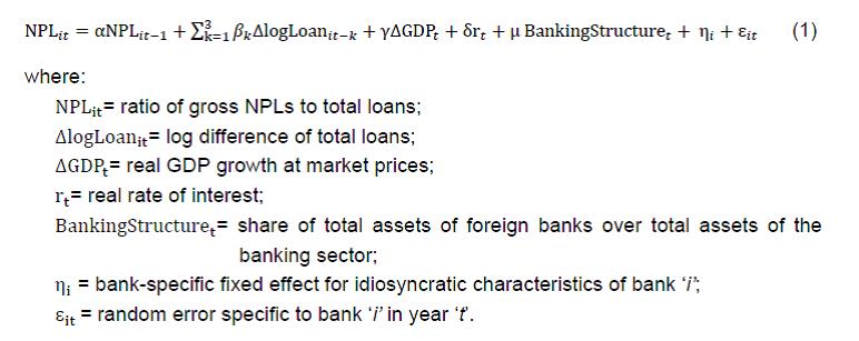 The empirical specification is designed to test how non-performing loans behave through the cycle. In particular, we estimate the following dynamic panel regression: ![]() The NPL ratio is transformed into a logit function ln(NPL/1-NPL). Given the persistence of NPLs, we use a dynamic specification that includes one lagged value of the NPL ratio as an explanatory variable. We use data on gross NPLs (including provisions) as the dependent variable, since this definition captures the overall quality of the loan portfolio (net NPLs reflect the realisation of loan defaults).15 The credit growth variable is lagged up to three years in order to capture the NPL dynamics comprehensively. Contemporaneous credit growth is not factored into the model because there will, of course, be an immediate, but possibly spurious, impact of credit growth on NPLs since credit also figures as the denominator in the NPL ratio in our model. The lags of up to three years have been selected by means of the Akaike criterion.16 Apart from credit growth, the baseline model uses real GDP, the real rate of interest and the share of foreign banks to capture the evolving banking structure in India.17 The definition of the complete set of variables used in the econometric analysis, including their sources, is reported in Table 1. We also carry out a number of robustness checks on the baseline model. First, we test for the asymmetric impact of loan growth on the NPL ratio to see if the impact is higher during expansionary phases than otherwise. To do this, we use the following model where we consider interactions with a boom dummy. ![]() The boom dummy takes the value of 1 if the credit-to-GDP gap is greater than 3 percentage points and 0 otherwise. The use of the gap in the credit-to-GDP ratio (defined as deviations from the stochastic trend in the ratio) and the 3 percentage point threshold deserves some further explanation. The gap has been suggested as a guide by the Basel Committee on Banking Supervision (BCBS) to calculate counter-cyclical capital buffers (CCBs) as part of its Basel III capital framework (BIS, 2010). This guide is recommended as a simple indicator of financial cycles and has been proved to be effective not just in advanced but also emerging economies to capture the build-up of financial vulnerabilities (Drehmann and Tsatsaronis, 2014). While adopting CCBs in the Indian context, the RBI has set the gap at 3 percentage points as the threshold for activation of the buffer by banks. Hence, we define a boom period if the credit-to-GDP gap is of 3 percentage points or more. Secondly, we control for asset concentration in the banking sector. The measure of asset concentration (using the Herfindahl Index) reflects the degree of consolidation, and could affect the prudence shown by banks in taking loan decisions (RBI, 2013a). In particular we use the following specification: ![]() Thirdly, we also control for the impact of collateral valuation on NPLs of banks, as shown in equation (4). We take the industrial stock index as a proxy for asset prices of the non-banking sector to control for the same.18 ![]() We test for the possible presence of structural breaks in the baseline model on account of the global financial crisis. We define a dummy Crisis that takes the value of 1 for the period 2009 to 2014 and zero otherwise and interact it with all the variables in our model. We have: ![]() Even though the beginning of the global financial crisis is associated with the collapse of Lehman Brothers in September 2008, as our data are for the financial year (April-March), the starting point for the crisis is taken to be 2009. Eichengreen and Gupta (2013) have defined the period of the global financial crisis to be 2008-2010, as they argue that the impact of the crisis had dissipated from 2011 onwards. However, as shown in Section 4, the health of the Indian banking sector, captured through NPLs, was on a slow downtrend since 2009, and has declined very rapidly since 2011. Hence, limiting the period of the crisis only to 2011 will not fully capture the ensuing impact of the crisis on India’s banking sector. Therefore, we define the period of the crisis to be 2009-14. Using the Chow test, we then test for the presence of a structural break in the baseline model. The null hypothesis for the test is as summarised in equations (6). ![]() In order to test as well as quantify the extent of procyclicality in NPLs with respect to credit by ownership of banks, we divide our sample of banks into two groups: public and private banks, and test the baseline model (1) on these two bank groups. It is worth mentioning that in the literature on India, it is a common practice to divide the banking sector into three categories – public, domestic private and foreign banks.19 This practice can be attributed partly to the nature of operations of foreign banks in India. Illustratively, all foreign banks in India till now have operated only in branch mode and many among these have a smaller presence in retail banking although in terms of prudential regulatory and bank licensing norms, there is no difference in the treatment given to these banks.20 In our study, however, we group domestic and foreign private banks into one category as (a) the key concern in this paper is to understand the role of public versus private ownership on the loan quality behaviour of banks irrespective of whether a private bank is held domestically or by a foreign entity; (b) we select only those foreign banks which have a greater involvement in retail banking such that they can be considered alongside their domestic counterparts; this point is illustrated later in this section when we discuss the criteria applied for choosing the sample of banks for our analysis. After analysing procyclicality by ownership of banks, we augment the baseline model using various bank-specific controls to test the other hypotheses. We draw on the existing literature in determining t