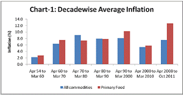 13. Consistent with the characteristic of a low income country, increase in wages in India has quickly translated to increase in per capita expenditure. Average nominal per capita expenditure increased sharply in the second half of the decade (2005-10) compared to the first half (2000-05), rising from 3.6 per cent per annum to 10.5 per cent in rural areas, and 5.3 per cent per annum to 10.9 per cent in urban areas. The MGNREGS has evidently set the floor for the rural wage level, making wage push inflation more visible and prominent. Admittedly, increase in wages need not be inflationary provided it reflects higher productivity, but that is not currently the case, a point to which I will return later. 14. The National Food Security Bill, 2011 is another potential source of pressure on inflation, and its inflationary impact will depend on the extent to which it will raise demand for food grains relative to the normal increase in supply. The proposed billtargets two categories of households - priority households and general households - under which 75 per cent of the rural population (with at least 46 per cent of the population belonging to priority households) and 50 per cent of the urban population (with at least 28 per cent of the population belonging to priority households) will become entitled to subsidized food grains. The price restrictions are quite exacting and failure by the government to meet the obligations entails payment of a food security allowance to the beneficiary. 15. Estimates suggest that 68 per cent of the country’s 1.2 billion population will get a legal entitlement for food grains after the bill is enacted, significantly raising the annual grain procurement demand even as the available marketed surplus would not increase correspondingly. This will create demand pressures, which will inevitably spillover to market prices of food grains. Furthermore, the higher food subsidy burden on the budget will raise the fiscal deficit, exacerbating macro level inflationary pressures. (iii) Large Increases in MSPs of Food Grains 16. Recent years have witnessed a significant increase in minimum support prices (MSP) of several agricultural commodities, pushing up food inflation. This is particularly evident from the neatly anchored co-movement of market prices and MSPs for rice and wheat [Chart-6]. The Commission for Agricultural Costs and Prices (CACP) has typically followed a cost plus pricing formula for determining the MSP, and in an environment of rising wages and increasing input costs, rising MSPs have accentuated inflation pressures.