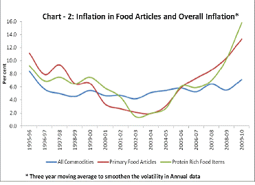 10. Even in the face of such structural changes in dietary habits, inflation is not inevitable. The reason structural changes have triggered inflation in India is that the supply response in respect of most protein items has not been adequate. With the exception of pulses, other protein rich items are not crop products. This is an important point since it explains the growing disconnect between the performance of agriculture and the trajectory of food inflation. (ii) Pressure on Food Inflation Stemming from Inclusive Growth 11. Unlike the growth-inflation tradeoff, the possible tradeoff between inclusive growth and inflation has not received much attention. The need for making growth inclusive is incontestable, but it is important to recognize that policies aimed at inclusion can stoke inflationary pressures, at any rate in the short-term. I could mention two examples here:first, the significant increase in rural wages triggered by the MGNREGS, and second, inflationary implications of the proposed Food Security Bill. 12. The MGNREGS, guaranteeing at least one hundred days of wage employment to rural labour, in implementation since February 2006, has pushed up rural wages, in line with the expected outcomes of the scheme. The indexation of the wage rate to CPI-AL since the beginning of 2011 has exacerbated the wage-price inflation spiral. NSSO survey data (61st Round and 66th Round) suggest that nominal wages of workers, in both rural and urban areas, increased much faster in the second half of the 2000s than in the first half. In most states, wageshave increased faster thanCPI-RL inflation,pushing up real wages [Chart-5].