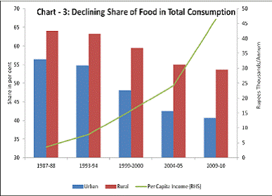 III. Factors Driving Food Price Pressures 6. What are the factors driving food inflation? I would emphasize the following: (i) shift in dietary habits towards protein foods; (ii) pressure stemming from inclusive growth policies; (iii) large increases in MSPs of foodgrains; (iv) shocks from global food inflation; and (v) financialisation of commodities. Let me take them up one by one. (i) Shift in Dietary Habits Towards Protein Foods 7. A distinct feature of recent food price inflation has been the sustained price pressure in protein rich items (pulses, milk, fish, meat and eggs). Inflation in protein rich items has generally exceeded both headline (WPI) inflation and inflation in primary food articles [Chart-2]. 8. As one would expect, the share of food in total expenditure has declined over successive rounds of NSSO surveys alongside increases in per capita income, consistent with Engel’s Law [Chart-3].