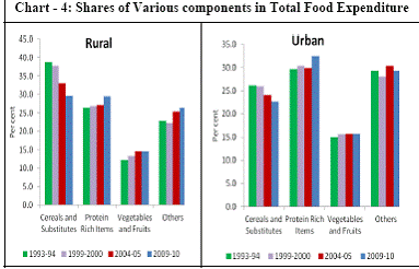 9. We need to turn to the lesser known Bennet’s Law for an explanation of food inflation. Bennet’s Law suggests that as incomes increase, the proportion of starchy staples in the food basket declines relative to the share of more expensive sources of calories. Recent NSSO data showing a significant increase in the share of protein rich items in total food expenditure, both in rural and urban areas, confirm this hypothesis [Chart-4]. Though protein inflation, reflecting changing dietary habits, was evident earlier as well, the pace of increase has been sharperin recent years reflecting,in part, accelerated increases in nominal wages.