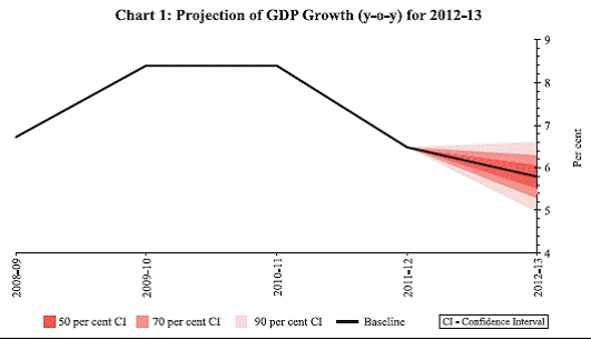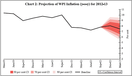 Inflation 37. Looking ahead, the path of inflation will be shaped by two sets of counteracting forces. On the downside, slower growth and excess capacity in some sectors will help moderate core inflation. Stable, or in the best case scenario, declining commodity prices will reinforce this tendency. An appreciating rupee will also help to contain inflationary pressures by bringing down the rupee cost of imports, especially of commodities. On the upside, persistent supply constraints may be aggravated as demand revives, resulting in price pressures. Rupee depreciation, which may result from global financial instability, will add to imported inflation. An important driver of inflation is the upsurge in both rural and urban wages, which is exerting cost-push pressures. Finally, as under-pricing in several products is corrected as part of the fiscal consolidation process, suppressed inflation is being brought into the open. As necessary a step as this is, it will result in higher inflation readings. 38. Taking into consideration the above factors, the baseline projection for headline WPI inflation for March 2013 is raised to 7.5 per cent from 7.0 per cent indicated in July (Chart 2). Importantly, it is expected to rise somewhat in Q3 before beginning to ease in Q4.