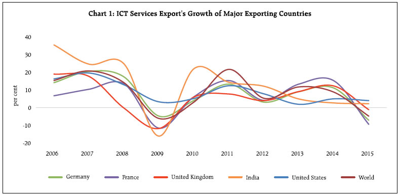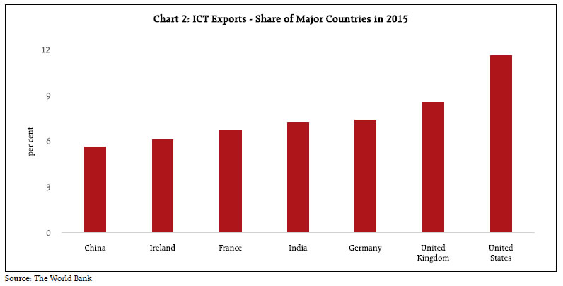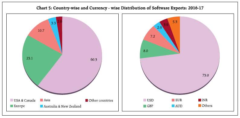 The 2016-17 round of Reserve Bank’s annual survey on computer software and information technology enabled services (ITES) exports reveals that India’s software services business exhibited resilience amidst subdued global demand conditions, supported by shifts in type of services exported and in modes of supply, especially through commercial presence of Indian companies abroad1. 1. Introduction India is a major provider of software and information technology (IT) enabled services in the global arena. The contribution of these services to India’s gross domestic product (GDP), employment and exports has also risen substantially over the years. Consequently, an ecclectic assessment of the sector’s performance warrants an evaluation of various attributes such as type of activity, on-site/offsite nature of services, export destinations and modes of supply. It is in this context that the Reserve Bank has been conducting surveys on exports of computer software and information technology enabled services (ITES) since 2002-03, as per the recommendations of the National Statistical Commission. The conduct of the survey has been enriched by guidance from the Technical Group on Computer Services Exports. The survey follows the concepts given in the IMF’s Balance of Payments and International Investment Position Manual (BPM6), 2008 and the Manual on Statistics of International Trade in Services (MSITS), 20102. For the 2016-17 round3, the eleventh in the series, 7,506 companies were approached and valid responses were received from 1,158 companies which together accounted for 81.2 per cent of total software services exports from India during the year. For the non-responding companies, estimates of software exports were generated (Annex). The remainder of this article is organised into four sections. Some stylised facts on information and communication technology (ICT) services by India vis-à-vis major countries are presented in section 2. Software and ITES export activity of Indian companies canvassed in this round of the survey are described in section 3, covering industry and organisation profile, export destinations, currency composition, modes of supply and software business of subsidiaries/ associates. Section 4 summarises the main takeaways and sets out concluding observations. 2. Global Software Services Exports: Stylised Facts Global exports of information and communication technology (ICT) services recovered rapidly from the global financial crisis by 2011. In more recent years, though, there has been moderation in growth across major suppliers (USA, UK, Germany, India and France) (Chart 1). India remains among the top four countries providing ICT services, and its share in world ICT exports has been gradually increasing (Chart 2). As per balance of payments (BoP) statistics, India’s exports of software services grew at a compound annual growth rate (CAGR) of 30.2 per cent in US dollar terms during the period 2000-01 to 2007-08. This pace of growth has tempered subsequently, with the CAGR dropping to 12.5 per cent during 2009-10 to 2012-13 and further to 2.0 per cent during 2013-14 to 2016-17. During 2016-17, software services receipts (net) accounted for 72.1 per cent of India’s net invisible surplus of US$ 97.1 billion, which helped in restricting the current account deficit to US$ 15.3 billion, despite a trade deficit of US$ 112.4 billion during the year. India’s total exports of computer services and ITES/ business process outsourcing (BPO) services from cross-border supply (mode 1), consumption abroad (mode 2) and presence of natural persons (mode 4) recorded 10.3 per cent annual growth to US$ 97.1 billion (Chart 3) (comparision of survey estimates with the NASSCOM’s estimates is described in Box 1). Computer services continue to be the dominant component of India’s software services exports with a share of around 70 per cent (Table 1). Engineering services have gradually increased their contribution in overall ITES exports over the last decade. Overseas commercial presence of subsidiaries and affiliates of Indian companies (i.e., mode 3) augmented India’s overall software exports (Chart 4). 3. The 2016-17 round of the ITES Survey The survey categorises ICT services in accordance with the MSITS Manual (2010). As per the manual, there are four modes of international trade in services, viz., transactions between residents and non-residents covering cross-border supply (mode 1), consumption abroad (mode 2), services provided locally by commercial presence through affiliates established abroad (mode 3) and presence of natural persons (mode 4). Under the BoP concept, however, overseas affiliates are treated as domestic units in the host economy and hence the services delivered by them are not considered as exports of the home country. To this extent, data on services exports in the BoP differ from those in the foreign affiliates trade statistics (FATS). 3.1 Industry-wise Distribution of ITES/BPO Services Exports Exports of ITES/BPO services are categorised as per the industrial classification of the Department of Information Technology (DIT-2003), Ministry of Electronics and Information Technology, Government of India. During 2016-17, exports of BPO and engineering services increased significantly, with finance and accounting, auditing, book-keeping and tax consulting services being the major components. It is also noteworthy that the share of customer interaction services under BPO has nearly halved over the last five years (Table 2). The share of engineering services in total ITES/ BPO services’ exports has increased in the recent times, reflecting diversification efforts undertaken by companies. The contribution of product design engineering has accelerated, while other BPO services (e.g., legal services, animation, gaming, pharmaceuticals and biotechnology services as well as combination of services) accounted for more than half of the ITES/BPO services. 3.2 Organi