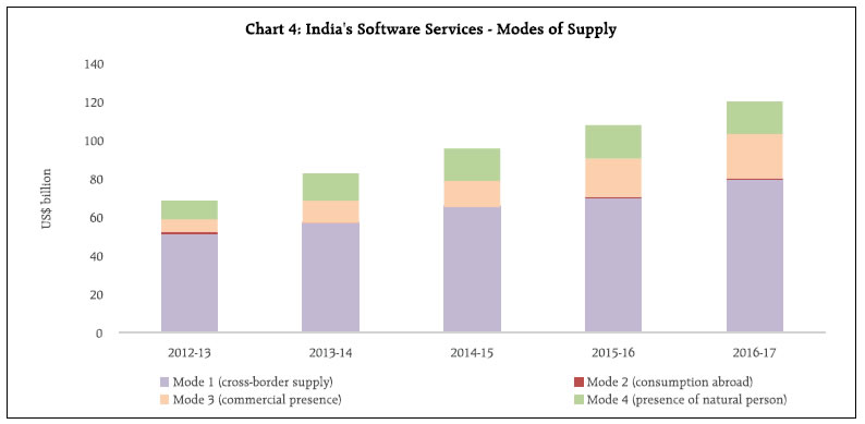 3.5 Software Business of Subsidiaries/ Associates Software business of foreign subsidiaries/ associates of Indian companies (foreign affiliates) are components of foreign affiliate trade statistics (FATS). Total software business (excluding the services provided to India) of the foreign affiliates of Indian companies increased by 13.2 per cent to US$ 25.6 billion (₹ 1,712.9 billion) in 2016-17 as overseas subsidiaries focused on local business in the host countries: their business with India, however, declined during the year (Chart 6). Most of the foreign affiliates of Indian companies provided multiple services (i.e., a combination of IT services, software product development, BPO services and engineering services). In the instances where activity-wise revenue segregation is not available, the services provided by companies are classified under ‘other services’ (Table 6). Nearly two-third of total software business by foreign affiliates was concentrated in the USA. The UK is the other major partner but its share declined during the year. Canada and Germany were other significant trade partners and their shares increased marginally during the year (Table 7). 4. Conclusion India’s exports of software services (including ITES), which grew at a remarkable pace during 2001-08, were dented in the aftermath of the global financial crisis but recovered subsequently. The subdued pace of global economic activity has, however, adversely affected external demand conditions during the last three years. Of the total business of software services provided by India across the globe, services provided through foreign affiliates of Indian companies have steadily increased and reached around one-fifth of the total. Recently, overseas subsidiaries of Indian companies have focused on local business in the host countries. Cross-border supply continues to be the dominant mode of software exports and the share of on-site delivery has gradually declined over the last decade. India’s exports of ITES/BPO services grew faster than computer software services though the share of customer interaction services has halved during the last five years. The US dollar remains the principal invoicing currency but the share of Rupee invoicing is rising albeit from modest levels. In recent years, software export destinations have diversified, with increased exports to the Asian region. The lion’s share of business for Indian software companies continue to come from the USA and the UK. References Central Statistical Organisation, Government of India (2001): Report of the National Statistical Commission (Chairman: Dr.C.Rangarajan). International Monetary Fund (2008): Balance of Payments and International Investment Position Manual (BPM6). National Association of Software and Services Companies (NASSCOM): The IT-BPM Industry In India 2017: A Strategic Review. Reserve Bank of India: Annual Survey on Computer Software and Information Technology Enabled Services Exports, Reserve Bank of India Bulletin (various issues). The World Bank: World Development Indicators https://data.worldbank.org/indicator/BX.GSR.CCIS.ZS. United Nations Statistics Division, Eurostat, International Monetary Fund, Organisation for Economic Cooperation and Development, United Nations Conference on Trade and Development, World Tourism Organisation and World Trade Organisation (2010): Manual on Statistics of International Trade in Services. Methodology for Estimation of Software Services Exports of Non-responding Companies Annual survey on software and ITES exports for 2016-17 was launched among nearly 7,506 Software and ITES/BPO companies. Of these, 1,362 companies responded to the survey which included 204 nil-reporting companies. The non-respondent companies were generally the smaller companies, as the 1,158 active companies that supplied data included all major companies in the sector. Using the observed proportion, number of companies with NIL exports was estimated from 6,144 nonrespondent companies and software exports have been estimated for the remaining 5,224 nonresponding companies, using the following method: I. Based on the ITES/BPO reported activity, companies have been classified in four groups: (i) IT services, (ii) ITES/BPO services, (iii) engineering services and (iv) software product development services (having 100 per cent business under respective group). II. For classifying the other companies having combination of these as their business activity, reported proportions of their exports done in the above-mentioned four group of services have been used. III. It was observed that major companies primarily reported on-site software exports. Therefore, only off-shore software exports component was used for estimating software exports of nonresponding companies. IV. As the observed distribution of exports was highly positively skewed in each of these groups, median was used for estimating software exports in each group. Estimated software exports for ith group of nonresponding companies ![]() Total software exports of India has been compiled as the sum of reported software exports and the estimated software exports for non-responding companies in each of the four groups. Using the methodology given above, the software services exports of non-respondent companies was estimated to the tune of ₹ 1,223.9 billion (around 18.8 per cent of total software services exports). * This article is prepared by Prithwis Jana, Seema Jaiswal and Pallavi in the External Liabilities and Assets Statistics Division, Department of Statistics and Information Management. The views expressed here are those of the authors and are not necessarily shared by the Reserve Bank. 1 The previous article in the series with reference period 2015-16 was published in the November 2016 issue of the Reserve Bank of India Bulletin. 2 The MSITS is a joint effort of seven major international agencies, viz., the United Nations, the Eurostat, the International Monetary Fund, 