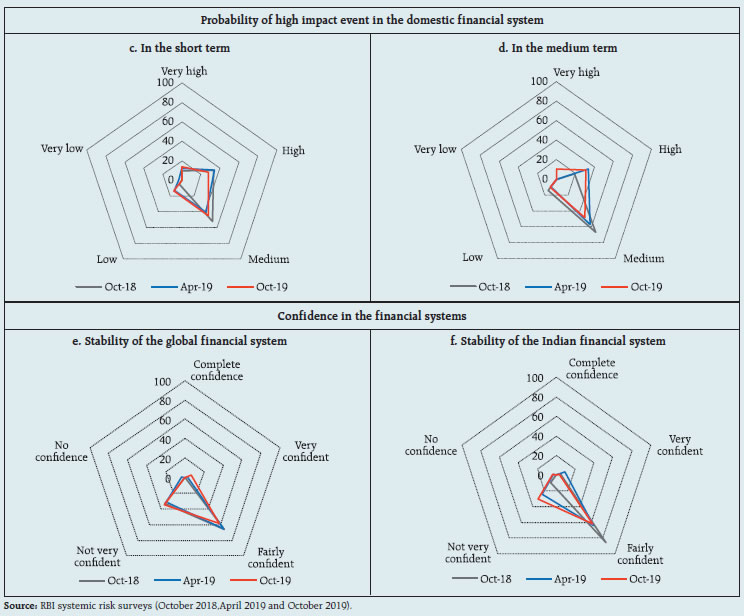 The systemic risk survey (SRS), the seventeenth in the series, was conducted during October-November 2019 to capture the perceptions of experts, including market participants, on the major risks presently faced by the financial system. According to the survey results all major risk groups viz., global risks, risk perception on macroeconomic conditions, financial market risks and institutional positions were perceived as medium risks affecting the financial system (Figure 1). Within global risks, the risk on account of global growth was categorised as high risk. Within the macroeconomic risks group, risks to domestic growth, fiscal deficit, risks on account of corporate sector vulnerabilities and household savings were perceived to be in the high-risk category. Among the institutional risks, the risks on account of asset quality deterioration and level of credit growth were perceived as high risk factors (Figure 2). ![]() ![]() Participants opined that banks have become more prudent and have tightened their appraisal over the last couple of years substantially. Despite measures taken by the Reserve Bank, transmission of rate actions is still slow. This coupled with continued risk aversion, has thrown up challenges to the flow of credit to the productive sectors. Demand position for next 3 months may be lower on account of no trigger for fresh increase in demand for goods and services (such as festivals). Notwithstanding the persistent weakness in private investment activity, fiscal spending and better rural economy with a good monsoon should spur some consumption going forward. About 32 per cent of the respondents opine that the prospects of Indian banking sector are going to improve marginally in the next one year while 25 per cent of the respondents feel that the prospects are going to deteriorate marginally (Chart 1). Banking sector participants opine that unless the resolution of the legacy bad assets (especially NCLT1 and 2) are completed, the banking system may find it difficult to support the economic growth aspirations. ![]() Majority of the participants in the current round of survey expect possibility of occurrence of a high impact event in the global financial system in the short term (upto 1 year) as medium. However, in the medium term (1 to 3 years) majority of the participants in the current round of survey assign a high probability to the occurrence of a high impact event in the global financial system. In the Indian financial system possibility of occurrence of a high impact event in the short-term as well as in the medium term has been assigned medium. There was a decrease in the respondents in the current survey who were fairly confident of the stability of the global financial system (Chart 2). ![]() ![]() Majority of the respondents were of the view that the demand for credit in the next three months would increase marginally. Average credit quality is however expected to deteriorate marginally in the next three months (Chart 3). ![]() |
