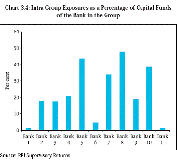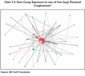 3.16 Going forward, an indicator based approach for the identification of FCs will need to be developed. The framework will need to factor in the work of the Basel Committee for D-SIBs as well as ongoing FSB work related to identification of systemically important insurance companies and identification of systemically important non-bank financial institutions (other than insurers and financial market infrastructures). Some of these FCs of which the bank is the parent entity, are likely to be identified as D-SIBs. An Inter Regulatory Forum for monitoring FCs set up by the Sub-Committee of the Financial Stability Development Council (FSDC) is examining the related issues. Intra Group Transactions and Exposures (ITEs) 3.17 ITEs invoke supervisory concerns due to the possibility of regulatory arbitrage and risk concentrations within the Group. With different approaches to setting limits or defining concentrations in entities within a Group or where there are unregulated entities, the differences in requirements can result in regulatory arbitrage. ITEs could also lead to drain on capital and double or multiple gearing which could impinge adversely on the banking group. The presence of ITEs can potentially complicate the resolution of the regulated entities within a troubled or failing conglomerate (Chart 3.3). 3.18 In the Indian context, an analysis of the magnitude of intra group exposures as on June 30, 2012 in the case of 11 large banks (including some FCs) indicates that such exposures comprise a significant percentage of the capital funds of the banking company in some cases (Chart 3.4).