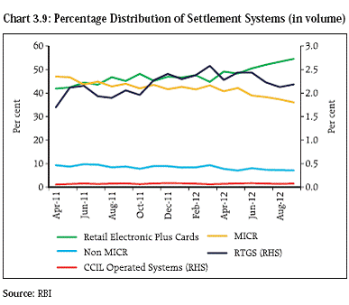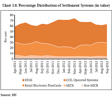 3.32 Plugging the data gaps will be necessary for a holistic assessment of the size of the non banking financial segment in the country and of the systemic risks posed by the segment. To address these issues, a Working Group with representation from all the financial sector regulators is attempting to “macro map” the shadow banking sector in the country. Bancassurance 3.33 Banks account for a significant share in the distribution of products in the life insurance segment. IRDA issued, in October 2012, a revised exposure draft on bancassurance. The proposed regulations allow banks to sell insurance products by either becoming a broker or a corporate agent. Banks selling insurance products offer several benefits viz., it encourages customers of banks to purchase insurance policies and further helps in building better relationship with the bank; reach of insurance products could improve through the widely distributed networks and better marketing channels of banks; and the increased competition could facilitate better premium rates and services for the customer. However, as highlighted in the previous FSR, many instances of mis-selling of insurance products through this channel have been evidenced. The exposure draft seeks to leverage on the benefits of bancassurance while addressing the concerns of mis-selling through stipulations such as imposition of a ceiling on number of tie ups a bank can enter into as bancassurance agent, improved grievance redressal systems, prescription of a code of conduct and enhanced due diligence and compliance of KYC (Tables 3.1 and 3.2). 3.34 Several aspects of the exposure draft will need careful consideration. Extant regulations do not permit banks to become insurance brokers. Banks assuming the role of insurance brokers may also lead to conflict of interests where the bank is also the promoter of an insurance company. Further, some provisions of the exposure draft, if implemented, may expose the banks to reputational risks. Payment and Settlement Systems 3.35 The payment and settlement systems continued to function in a robust manner with increased usage of electronic modes of transaction settlement (Charts 3.8 and 3.9). Regular disaster recovery tests for large value payment systems testified to the robust arrangements in place for business continuity of such systems. 3.36 The Reserve Bank released its Payment Systems Vision Document for the three year period (2012-2015) in June 2012. The document reaffirms the Reserve Bank’s commitment towards providing safe, efficient, accessible, inclusive, interoperable and authorised payment and settlement systems for the country. Margin Movements in Foreign Exchange Settlements 3.37 The global financial crisis has brought to the fore the risks to financial stability posed by excessive procyclicality of the financial system which could amplify swings in the real economy and exacerbate market stress and volatility. In the case of OTC derivatives market, procyclicality could be caused by the correlation between changes in risk management practices (margins, haircuts) and business or credit cycle fluctuation. The margining policies of central counterparties (CCPs) and exchanges acquire particular importance in this context. CCPs impose margins in order to protect the systems from potential future losses arising from counterparty failures. But, if the assessment of potential future losses is based purely on volatility, there will be a sharp increase in margins if market volatility were to increase. Key considerations enunciated in the recently issued Principles for Financial Market Infrastructure14 on collateral and margins, emphasise the need to establish stable collateral and margining policies that reduce the need for procyclical adjustments.