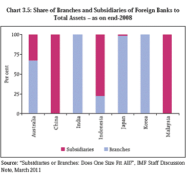 3.19 Keeping in view the risks posed by ITEs, the Reserve Bank has issued draft guidelines in August 2012 to ensure that banks maintain arms length relationship in their dealings with the Group entities. Both quantitative limits for the financial ITEs8 and prudential measures for the non-financial ITEs9 have been proposed so as to contain concentration and contagion risk arising out of ITEs. Recent amendments to the banking legislations granting powers of consolidated supervision will further equip the Reserve Bank to, inter alia, monitor such risks (Box 3.3). Subsidiarisation of Foreign Banks 3.20 The increasing complexity and interconnectedness of cross border banking groups, along with the absence of effective resolution regimes, has led to an emerging debate about the preferred cross-border banking structure, viz., “subsidiarisation” as opposed to foreign banks operating as branches in the host country. Different models/ combinations of cross border banking structures co-exist in different regions (Chart 3.5). 3.21 From the perspective of policymakers-both home and host authorities, subsidiarisation has important stability implications. Home authorities might prefer the subsidiary model when their banks expand into risky cross border business environments. Host authorities might also prefer the subsidiary model, because the problems of the parent would not be passed down to the affiliate. Potential down side risks may arise if subsidiaries promoted by foreign banks become dominant in the domestic financial system. Anecdotal evidence suggests that, in countries where such subsidiaries had a large presence, they tended to substantially curtail their operations or withdraw from the host country when there were adverse developments in their home country. In addition, setting up of subsidiaries will not necessarily ensure unconditional support from the parent bank.