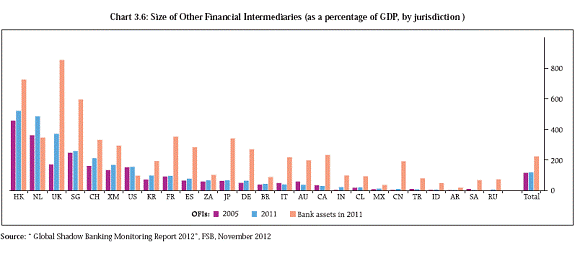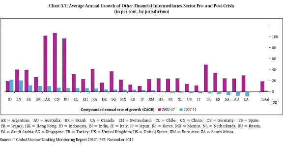 Securitisation Since the crisis, many regulatory reforms, including reforms related to retention requirements and measures to enhance transparency and standardisation of securitisation products, have been undertaken to address the systemic vulnerabilities and incentive problems associated with securitisation. Further, possible policy actions have been identified towards convergence and enhanced monitoring of risk retention requirements, improving disclosures by issuers and encouraging standardisation of securitisation products. Securities lending and repos To address financial stability risks arising from practices in the securities lending and repos market, a series of policy recommendations are being developed. These encompass improved reporting to regulators and end-investors, improving transparency and disclosures, addressing risks associated with re-investment of cash collateral and with re-hypothecation of client assets, introducing minimum standards for haircut practices, strengthening collateral valuation and management practices, exploring the feasibility of establishing central clearing and addressing bankruptcy law treatment of securities lending and repo transactions. 3.27 In the Indian context, a Working Group on “Issues and Concerns in the NBFC Sector” set up by the Reserve Bank had made a series of recommendations to address issues relating to regulatory arbitrage and systemic risk, so as to create a strong and resilient nonbanking financial sector. Based on recommendations made by the Working Group, the Reserve Bank of India has, in December 2012, issued draft revised guidelines related to entry point norms, principal business criteria, prudential regulations, liquidity requirements for NBFCs and corporate governance. The draft guidelines have proposed ample transition time to bring the new regulatory framework into existence so as to ensure that the revised regulations are implemented in a non-disruptive manner. Growth Trends in the Non-Banking Financial Sector 3.28 In the Indian context, the ‘shadow banking system’, as it existed in much of the developed world is largely irrelevant as the regulatory perimeter of the country is relatively wide, encompassing most nonbanking financial entities. NBFCs are regulated by the Reserve Bank, while insurance companies and asset management companies are regulated by IRDA and SEBI respectively. 3.29 Over the years, the NBFC sector has seen a fair degree of consolidation, leading to the emergence of larger companies with diversified activities. There has been a gradual, regulation induced reduction in the number of deposit taking NBFCs from nearly 1500 in March 1998 to less than 300 currently. No new NBFC has been permitted to commence raising public deposits since 1997. 3.30 The size of the non banking financial sector, at 21 per cent of GDP, is relatively small compared to the global average. Post crisis, however, the growth rate of “other financial intermediaries13” has been relatively higher than peer economies including Mexico, Brazil, South Africa and China. While a part of the growth in this segment can be attributed to structural factors such as the financial deepening of the economy, the underlying trends will need to be closely monitored especially in view of the interdependencies between the banking and non-banking financial sector in the country, as discussed in Chapter II (Charts 3.6 and 3.7). Regulatory Coverage of the Non-Banking Financial Sector 3.31 There are, however, some gaps in terms of regulatory coverage and data availability in respect of the shadow banking system in the country. For instance,