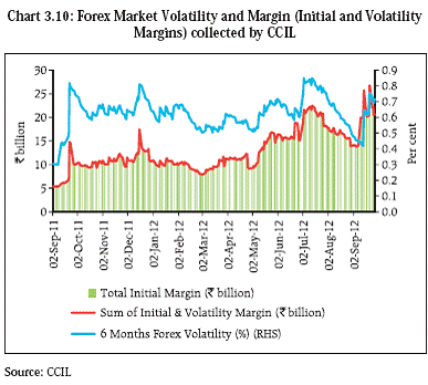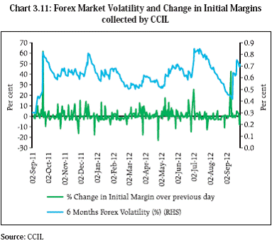 3.38 An analysis of the trends in foreign exchange market volatility and margins collected by the Clearing Corporation of India Limited (CCIL) over the last one year provide some indications of procyclicality. CCIL’s stipulation of a minimum margin as part of its initial margin computation could, however, reduce the procyclicality impact to some extent. Recent refinements to the initial margin computation carried out by CCIL to reflect the increased volatility of forward premium in USD/INR foreign exchange market have resulted in significant increase in minimum margin requirements. This could further mitigate the adverse impact of such procyclicality. Nonetheless, the underlying trends in margins will need to be closely monitored (Charts 3.10 and 3.11).