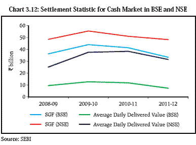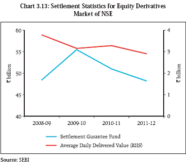 Settlement Guarantee Funds of Equity Clearing Corporations 3.41 “Owned funds” and the SGFs play a critical role in the risk management framework of a CCP which guarantees settlement of net obligations arising out of trades settled by it. The risk management framework of the CCP will therefore need to ensure that sufficient funds are available with it to meet the obligations of its members, including the member with the largest net debit position, should it default. In the case of equity clearing corporations in the country, the broad framework for risk management is prescribed by SEBI. 3.42 The funds/resources available to the CCP are typically employed in a hierarchical order in the case of a default by a member. For example, in the case of the NSCCL, the initial recourse is made to the margin contributed by the defaulting member and any contribution or deposit made by or bank guarantee arranged by the member to the SGF. If these funds are not sufficient, then other funds are sourced e.g. the amount of security deposit, if any, made by the defaulting member to the specified exchange; or the fines, penalties, interest on delayed payment, etc., if any, available with the CCP. Thereafter, the earnings of the CCP are used following which the amount of contribution and deposit made by all categories of clearing members to the SGF in proportion to the total contribution and deposit made by each clearing member are utilised. 3.43 An analysis of the SGF available with the major equity exchanges viz., NSE and BSE for cash and the derivatives segment indicates that, in most cases, the quantum of SGF is sufficient to cover the average daily delivered value. SEBI’s recent measures in mandating all stock exchanges to transfer 25 per cent of their profits to the SGF of the CCPs where their trades are settled, will further buttress the risk management framework of the CCPs (Charts 3.12 to 3.14).