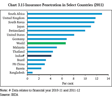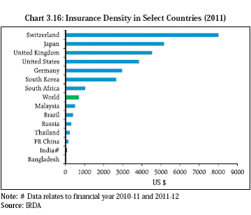 Insurance Regulatory and Development Authority (IRDA)20 3.71 For access to insurance products, the vast network of insurance offices including micro or oneman offices reaching out to several towns and villages is a pointer to the availability of sales touch points in smaller places. With a view to ensuring special attention to the rural, economically and socially vulnerable segments of the population, the IRDA (Rural and Social Obligations) Regulations cast obligations on Insurers to cover these segments under insurance. 3.72 The potential and performance of the insurance sector is universally assessed in the context of two parameters, viz., Insurance Penetration21 and Insurance Density22 (Charts 3.15 and 3.16). The Insurance Penetration was 2.32 (Life 1.77 and Non-life 0.55) in the year 2000 when the sector was opened up for private sector, and has increased to 4.10 in 2011 (Life 3.4 and Non-life 0.7). The insurance density in India was US$9.9 in 2000 which has increased to US$59 in 2011 (Life 49 and Non-life 10). For the year 2011- 12, more than 31 per cent of the total life insurance policies were issued in rural areas. In non-life sector, a business of ` 74.7 billion which constitutes 14.1 per cent of total non-life insurance business was generated from rural areas. 3.73 IRDA has pioneered the issuance of Micro Insurance Regulations which encourage simple and low ticket premium products covering the risks of life as well as livelihood. Many categories of individuals and entities that were considered by the Reserve Bank to act as BCs are under consideration of IRDA for according Micro Insurance Agency eligibility, with a few exceptions. Further a number of District Cooperative Banks, Regional Rural Banks and urban co-operative banks that are working in rural and semi urban areas are also being considered for permitting to act as Micro Insurance Agents. In addition to one Life Insurance Company and one General Insurance Company, a Micro Insurance Agent is now proposed to be permitted to work with Agriculture Insurance Company of India Ltd for the limited purpose of distributing crop insurance. The proposed modified regulations also entitle the individual insurance agents, who were already licensed to act as insurance agents, in rural areas where population is not more than 2000, to the higher percentage of Micro Insurance Remuneration. Further, it is also proposed to link the higher remuneration / commission rates payable on Second and Subsequent years’ premium to the persistency rate of Micro Insurance business portfolio of Micro Insurance Agent so as to encourage and emphasize on the quality of business.