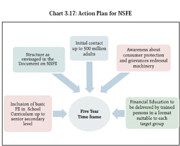 3.74 As regards the scope of Micro Insurance Products, in the existing regulations, non life Micro Insurance (MI) products are covering retail risks faced by individuals. They do not address the institutional risks faced by Micro, Small and Medium enterprises that are playing a significant role in the country’s growth. Therefore, a proposal is under consideration that General (Non Life) Insurance policies issued to Micro, Small and Medium Enterprises as defined in Section 7 of Micro, Small and Medium Enterprises Development (MSMED) Act, 2006 under various classes of non-life insurance business will be qualified as non-life micro insurance business up to a premium of ` 25000 per annum per policy. However, the non life insurance companies will have enough discretion to decide whether to appoint MI Agents, if so to which sector / enterprises of MSME Sector. Pension Fund Regulatory and Development Authority (PFRDA) 23 3.75 Old age protection is an essential part of the social security needs of the unorganized sector and should form an important welfare goal. Introducing a Defined Contribution pension scheme (NPS-Swavalamban) for the unorganized sector workers enabling them to save small amounts during their productive years with a co-contribution from the government is an important step in achieving old age income security. Not only does the scheme enable aggregation of small savings, it also helps the government in limiting its liability and projecting the funding requirement. A number of countries such as Mexico, Vietnam run such cocontributory pension schemes. Securities and Exchange Board of India(SEBI) 24 3.76 SEBI is furthering financial inclusion via a number of measures. With a view to achieve wider financial inclusion, encourage holding of demat accounts and to reduce the cost of maintaining securities in demat accounts for retail individual investors, SEBI has decided that all depository participants (DPs) shall provide a “Basic Services Demat Account” (BSDA) with limited services, which will not charge any fee upto holding worth of `50,000/- and nominal charge of `100/- upto holding of `2,00,000/-. In order to encourage participation of small investors (who may not be tax payers and may not have Permanent Account Number (PAN)/bank accounts, the KYC requirement (such as PAN, Bank A/c’s etc.) has been relaxed for the investment upto `20,000 per investor, per mutual fund, per financial year subject to certain conditions. In order to encourage distribution of Mutual Fund products to semi-urban and rural areas, additional Total Expense Ratio (TER) upto 30 basis points has been allowed to be charged if net flows from beyond 15 cities are at least 30 per cent of gross new inflows / 15 per cent of assets under management. Other measures such as increasing the category of persons to be employed as mutual fund distributors have been undertaken to improve mutual fund penetration in rural and semi-urban areas. 3.77 SEBI has initiated a multipronged approach to spread financial literacy all over India. Investor Awareness Programs/ Workshops are organized for educating investors and to spread awareness. Regional Seminars are conducted in association with various exchanges, depositories and trade bodies. The objective of such seminars is to reach out to more people and concentrating primarily on tier 2 and tier 3 cities. SEBI continues its association with Investor Associations (IA) as well as Exchanges, Depositories and various trade bodies etc. It has launched a financial education drive through Resource Persons (RPs). The program aims at imparting understanding of financial concepts to the targeted groups. These empanelled RPs also supplement the investor education programs that are conducted through investor associations. A Pocket Money Program for school students jointly with National Institute of Securities Market is positioned as an important life skill at the school level (including municipal schools) targeting mainly 8th and 9th standard students. National Strategy on Financial Education (NSFE) 3.78 A draft document on the NSFE has been prepared under the aegis of the Technical Group on Financial Inclusion and Financial Literacy, set up by the Sub Committee of the FSDC. The draft Strategy seeks to create a financially aware and empowered India. The Technical Group had constituted a Sub Group to draft the NSFE for India. The Strategy prepared by the Group envisages ways towards creating awareness and educating consumers on access to financial services; availability of various types of products and their features; changing attitudes to translate knowledge into responsible financial behaviour; and making consumers of financial services understand their rights and obligations. The Strategy calls for active involvement of individuals, financial sector regulators, educational institutions, NGOs, financial sector entities, multilateral international players and the Government at both the Centre and the States. The Strategy envisages a time frame of five years for its financial education campaign (Chart 3.17). 3.79 The draft NSFE was placed in the public domain by all the financial regulators for public consultation in August 2012. Currently, the Technical Group is finalising the Strategy and drawing up a road map for its implementation.