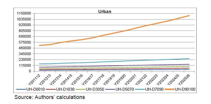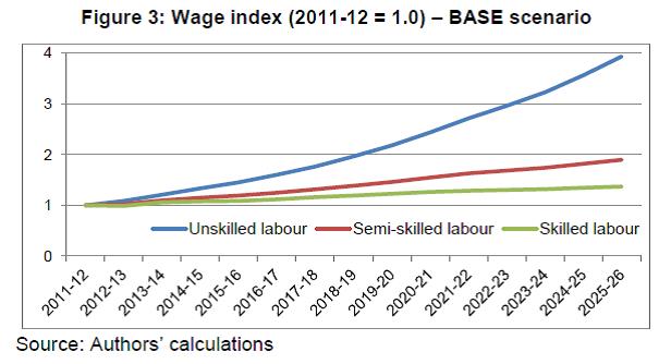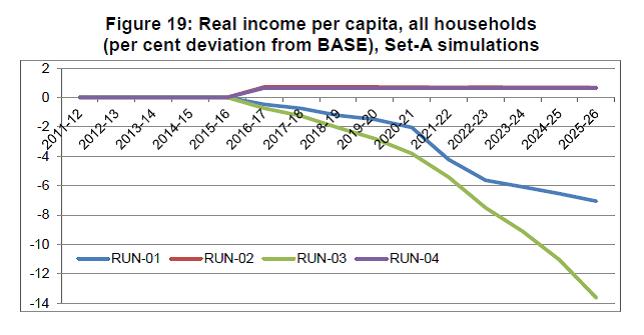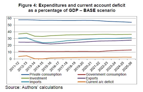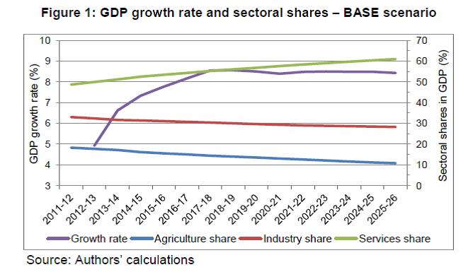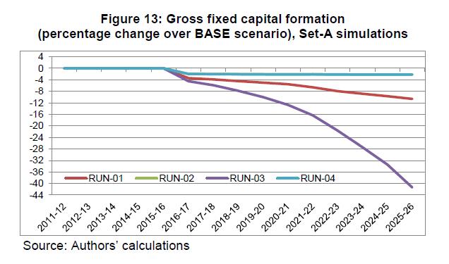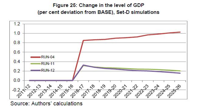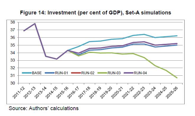 The impact of the difference in the closure for foreign exchange market between RUN-13 and RUN-14 needs to be noted. In RUN-13 where the foreign capital flows is fixed at BASE level, the exchange rate depreciates slightly by about 10 basis points. Whereas in RUN-14, where the exchange rate is kept fixed at BASE level, the CAD jumps up sharply in 2016-17 over the BASE level and thereafter this difference narrows down somewhat. The rise in investments generates additional import demand, which is the main driver of the rise in CAD in RUN-14. Additionally, the rise in import competition also adds to the reduction in output seen earlier, which results in lower exports in this simulation. Consequently, the rise in CAD results only in a small rise in foreign savings, and thus does not help reduce the additional tax burden on households. Turning to RUN-15 and RUN-16 we find that the impact of cut in the government consumption to generate the requisite savings to meet the investment target depends crucially on the exchange rate. In RUN-15 where we set the exchange rate at the BASE level, government has to cut its consumption expenditure by 18 per cent to 20 per cent over the years. Whereas in RUN-16, by allowing the Rupee to depreciate by 5 per cent in the first year of the shock (2016-17) the cut in government consumption expenditure required is only 10 per cent over BASE levels. But since the depreciation in the Rupee is restricted to only a quarter per cent annually from 2017-18 onwards we see that a larger and increasing amount of cut in government consumption expenditure is required to meet the investment target. To understand this further, it must be noted that in these two simulations (RUN-15 and RUN-16) there are no additional taxes on households, and government transfers and foreign remittances are also kept fixed in real terms at BASE levels. Consequently, household savings and consumption essentially reflect the changes in aggregate GDP from which households derive their income to a very large part. Thus, changes in private savings/ private consumption do not drive the results in these two simulations. The drivers are really the trade flows and foreign savings. The depreciation of the Rupee in RUN-16 helps expand exports (by 1.5 per cent to 2.2 per cent over time) and cut down on imports (3.5 per cent to nearly 6 per cent) due to which the CAD improves dramatically. Indeed, in 2016-17 the CAD as a percentage of GDP declines by 89 per cent over BASE levels, and falls thereafter such that by the terminal year the CAD is nearly entirely wiped out compared to BASE, which is reflected in foreign savings also. The fall in imports in RUN-16 shifts the demand in favour of domestic production and this is seen in the aggregate domestic demand rising by 3 per cent despite the fall in government consumption in this simulation. This coupled with the rise in exports catalyses the expansion in domestic production and consequently aggregate GDP expands in this simulation as seen earlier in Figure 26. In RUN-15, where the exchange rate is higher than in RUN-16, none of these favourable effects take place. Indeed, the rate is high enough to adversely affect exports and favour imports, and this eventually affects domestic production and aggregate GDP. In this study we examine the impacts of various types of government expenditure on the Indian economy. In particular, we examine the impacts of a rise in (a) Government consumption expenditure in general and the nature of the relation between government expenditure and GDP, (b) Government expenditure in Social Sectors and in Public Administration, (c) Government transfer payments to households, and (d) Public investment. Towards this, we have used a recursively dynamic CGE model of the Indian economy developed by Bhakta and Ganesh-Kumar (2016), which is built around SAM for the year 2011-12. The SAM and the model distinguish 9 commodities/ sectors, 9 factors of production, and 12 household types distinguished by their location and by the MPCE percentile. The model is solved annually over the period 2011-12 to 2025-26. This 15 year simulation period can be categorised into (a) the historic period covering the 5 years 2011-12 to 2015-16 for which the model replicates as closely as possible the actual observed values of key macroeconomic variables (annual growth in aggregate and sectoral GDPs, exports and imports, the shares of agriculture, manufacturing and services in total GDP, and the share of exports, imports and trade deficit in GDP), and (b) the future 10-year period from 2016-17 to 2025-26 over which various alternative scenarios are developed. As a first step, we develop a BASE scenario that captures a “Business As Usual” trajectory that the Indian economy is likely to take over the 10-year period 2016-17 to 2025-26 given the current structural characteristics of the economy, and the set of policies currently prevailing. Following an assessment of the available forecasts of the future growth of the economy from diverse sources such as the Government of India, Reserve Bank of India, the IMF, the UN and the World Bank, we develop the BASE scenario such that the growth rate of the economy improves steadily in the next couple of years and reaches a steady state growth rate of 8.5 per cent per annum from 2017-18 onwards. We then develop various counter-factual policy scenarios by introducing a ‘policy shock’ starting from the year 2016-17. The policy shock typically involves changing the values of specific parameter(s) that represent a certain government policy combined with a particular specification of macroeconomic closure of the model. The macroeconomic closure describes the functioning/ determination of (a) the factor markets, (b) foreign exchange market, and (c) savings-investment in the economy. In all we develop five sets of counter-factual policy scenarios to study the economy-wide impacts of different types of public expenditure. Each of 