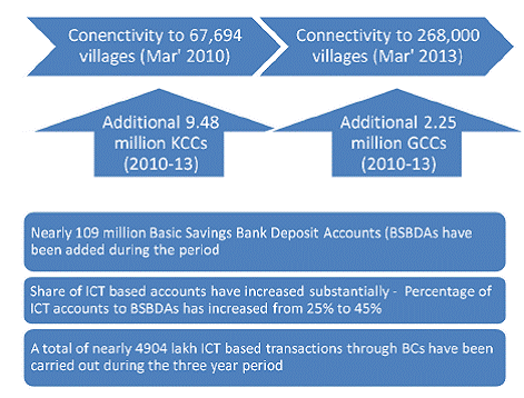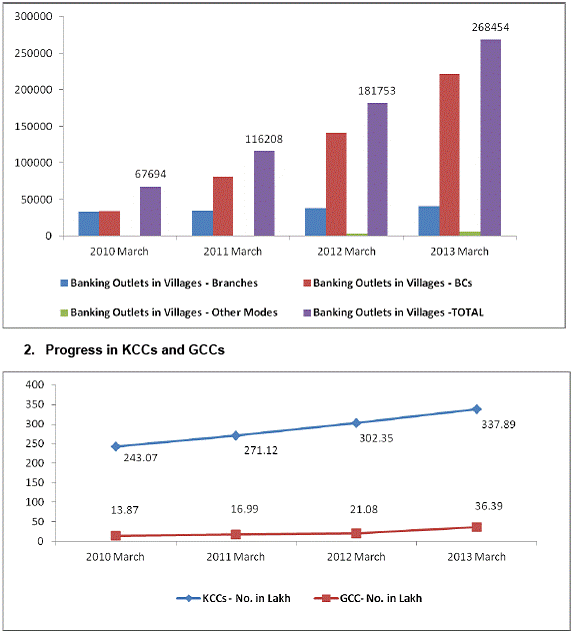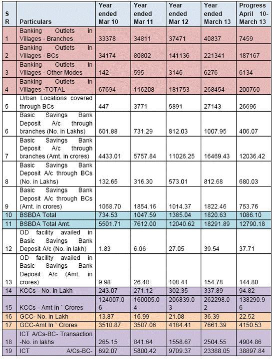 ![]() Since size of population and the distribution foot print of bank branches are not enough to cater each and every person in the country; to increase number of bank branches through FIP following initiatives were taken: Relaxed regulatory requirements i. Relaxed regulatory dispensation on KYC norms: Know Your Customer (KYC) requirements for opening bank accounts have been relaxed and simplified, especially for small accounts with balances not exceeding Rs. 50,000/- and aggregate credits in the accounts not exceeding Rs. one lakh a year. In modification to the earlier guidelines on KYC norms, RBI has now advised banks not to insist on introduction for opening bank accounts of customers. In addition to this RBI has now allowed banks to use Aadhaar Card as a proof of both identity and address and the MNREGA Job Card as an officially valid document for opening of bank accounts. ii. Mandatory requirement for opening branches in unbanked villages: To further step up the opening of branches in rural areas so as to improve banking penetration and financial inclusion rapidly, the need for opening of more brick and mortar branches, besides the use of BCs, was felt. Accordingly, domestic SCBs have been mandated in the Monetary Policy Statement – April 2011 to allocate at least 25 per cent of the total number of branches to be opened during a year in unbanked rural (Tier 5 and Tier 6) centres.There are few studies on the impact of bank branches and development In 2003 Burgess and Pande examined the branch expansion policy of commercial banks implemented post nationalisation From 1990 to 1997 the RBI branch authorisation policies specified that banks could establish a new bank branch in a location with one or more bank branches only if they set up four branches in a location with no new bank branches This regulatory prescription ensured that banks opened rural branches in states where financial development was lower to address the regional inequities in development.Their results to evaluate the impact of a new rural branch on poverty suggested that a one percent increase in the number of banks in rural locations reduced rural poverty by 0.36% per cent and increased total output by 0.55% per cent Rural branch expansion also increased non primary sector output and non agricultural employment. These favourable effects show the positive influence of bank branches on economic development Banks to the 1990s disbursed a greater share of credit to the less developed states this trend reversed after the 1990s. iii. In the Annual Policy Statement for 2013-14, banks have been advised to consider frontloading (prioritizing) the opening of branches in unbanked rural centres over a three year cycle co-terminus with their FIPs. This is expected to facilitate faster branch expansion in unbanked rural centres. “STEP INTO A BANK STEP OUT OF POVERTY IS OUR CENTRAL MESSAGE” ![]() iv. Business Correspondent/ Business Facilitator Model In January 2006, the Reserve Bank permitted banks to utilise the services of non-governmental organizations (NGOs), micro-finance institutions (other than Non-Banking Financial Companies) and other civil society organisations as intermediaries in providing financial and banking services through the use of business facilitator and business correspondent (BC) models. The BC model allows banks to do ‘cash in - cash out’ transactions at a location much closer to the rural population, thus addressing the last mile problem. As on March 31 2013, banks have reported deploying 1,95,380 BCs which covered 2,21,341 villages. v. Introducing Technology To ensure sustainability and scalability of business model, technology was adopted. It leads to higher costs at initial stage however; it brings better opportunities and optimization of result. The UID is also good instrument of connecting to all the people once it gets effectively operational. vi. The Direct Benefit Transfer scheme and the Adhar number are going to be very significant in the years to come the RBI has accepted Adhaar as a proof of identity and as fulfilling KYC requirements 1st of January, 2013. Nearly 11 lakh beneficiaries have received the benefit directly into their bank accounts. Financial Inclusion Plans of banks for 3 years: RBI in January 2010 had advised all public and private sector banks to submit a Board approved three-year Financial Inclusion Plan (FIP) starting April 2010. Banks were advised to devise FIPs congruent with their business strategy and comparative advantage to make it an integral part of their corporate plans. These plans broadly included self-set targets in respect of rural brick and mortar branches opened, BCs employed, coverage of unbanked villages with population above 2000 as also other unbanked villages with population below 2000 through branches/BCs/other modes, no-frills accounts opened including through BC-ICT, Kisan Credit Cards (KCC) and General Credit Cards (GCC) issued, and other specific products designed by them to cater to the financially excluded segments.Banks were advised to integrate Board-approved FIPs with their business plans and to include the criteria on financial inclusion as a parameter in the performance evaluation of their staff. The implementation of these plans was closely monitored by the Reserve Bank on a monthly basis through a quantitative reporting format. Qualitative aspect under FIP was monitored through a qualitative report submitted by banks on quarterly basis. A snapshot of the progress made by banks under the 3 year Financial Inclusion Plan (April 10 - March 13) for key parameters during the three year period is given below:- ![]() Challenges in Financial Inclusion