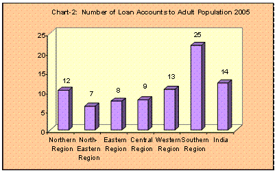 One common measure of FI is the percentage of adult population having bank accounts (Chart-1). Going by the available data on the number of savings bank accounts and assuming that one person has only one account, (which assumption may not be correct as many persons could have more than one bank account) we find that on an all India basis 59 per cent of adult population in the country have bank accounts – in other words 41 per cent of the population is unbanked. In rural areas the coverage is 39 per cent against 60 per cent in urban areas. The unbanked population is higher in the North Eastern and Eastern regions.