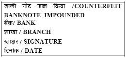 RESERVE BANK OF INDIA DETECTION AND IMPOUNDING OF COUNTERFEIT BANKNOTES 1. Authority to impound counterfeit banknotes The counterfeit banknotes can be impounded by - 2. Stamping on the counterfeit banknote Each banknote, which is suspected to be counterfeit or is found to be counterfeit, shall be branded with a stamp ‘COUNTERFEIT BANKNOTE’ and impounded. For this purpose, a stamp with a uniform size of 5 cm x 5 cm with the following inscription may be used.