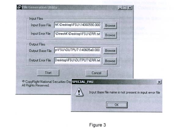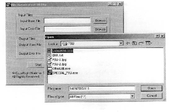 The utility contains name of utility at the top, buttons for minimizing and closing the utility, four text fields and four buttons named “Browse”, a start button and a cancel button. A copyright message and version number will also be visible. The user is required to enter valid inputs in all the four text fields described below. A. Input Base File: Input file name should be in “ddmmyyfv.bnk” format only.