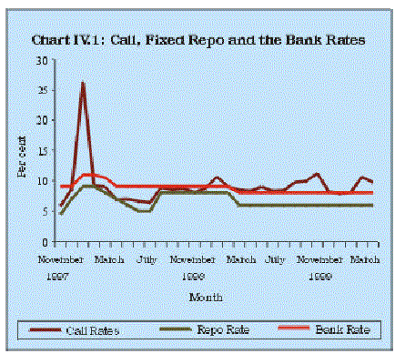 4.36 The annual turnover in the call money market at Mumbai which amounted to Rs.16,44,790 crore in 1991-92 and Rs.15,45,160 crore in 1996-97 moved up in more recent years. For example, the daily turnover increased to Rs.33,882 crore during 1999-2000 from Rs.25,956 crore during 1998-99. The average interest in the call money market during last four years tended to move up from 7.8 per cent in 1996-97 to 9.0 per cent during 1999-2000. However, volatility tended to move downwards (Table 4.1 and Chart IV.1).