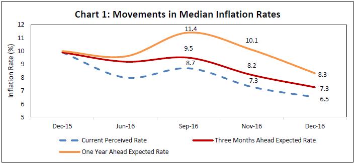 1. The proportion of respondents expecting the general level of prices to increase three months ahead and one year ahead declined sharply in the December 2016 round as compared with both the September and November 2016 rounds and the shift was towards ‘decline’ in prices. This was observed across all product groups, but was most prominent in food products and housing (Table 2).