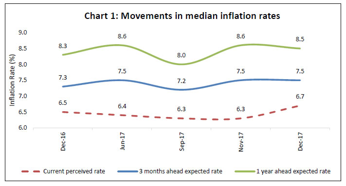 From a year ago, i.e. vis-à-vis the December 2016 round of the survey, both three months ahead and one year ahead inflation expectations rose by 20 bps. (Table 4)  | Table 1: Respondents’ Profile (Category): Share in Total Sample - December 2017 | | Category of Respondents | Share in Total (%) | Target Share (%) | | Financial Sector Employees | 9.9 | 10.0 | | Other Employees | 15.2 | 15.0 | | Self-employed | 19.7 | 20.0 | | Homemakers | 30.3 | 30.0 | | Retired Persons | 9.5 | 10.0 | | Daily Workers | 9.5 | 10.0 | | Others | 5.8 | 5.0 | | Table 2: Product-wise Expectations of Prices for Three Months ahead and One Year ahead | | (Percentage of Respondents) | | Round | Dec-16 | Jun-17 | Sep-17 | Nov-17 | Dec-17 | Dec-16 | Jun-17 | Sep-17 | Nov-17 | Dec-17 | | Options: General | Three Months Ahead | One Year Ahead | | Prices will increase | 59.9 | 77.2 | 81.3 | 81.4 | 80.6 | 68.1 | 82.4 | 93.5 | 92.8 | 92.7 | | Price increase more than current rate | 28.9 | 39.9 | 50.5 | 53.2 | 49.8 | 35.2 | 44.1 | 61.2 | 64.1 | 63.0 | | Price increase similar to current rate | 23.0 | 26.6 | 25.4 | 23.1 | 24.6 | 24.9 | 28.3 | 27.3 | 23.8 | 23.9 | | Price increase less than current rate | 8.0 | 10.7 | 5.4 | 5.1 | 6.2 | 8.0 | 10.1 | 5.0 | 4.8 | 5.8 | | No change in prices | 26.9 | 16.8 | 15.8 | 16.3 | 17.4 | 19.8 | 11.2 | 4.1 | 5.5 | 5.3 | | Decline in prices | 13.3 | 6.0 | 2.9 | 2.3 | 2.0 | 12.2 | 6.4 | 2.5 | 1.8 | 2.0 | | Options: Food Product | Three Months Ahead | One Year Ahead | | Prices will increase | 61.2 | 71.6 | 79.5 | 80.3 | 78.1 | 66.4 | 75.8 | 84.8 | 85.7 | 85.0 | | Price increase more than current rate | 30.3 | 39.1 | 47.5 | 50.4 | 45.8 | 32.2 | 38.0 | 51.4 | 54 | 52.1 | | Price increase similar to current rate | 19.6 | 21.8 | 24.8 | 23.2 | 23.4 | 24.1 | 26.8 | 27.5 | 25.2 | 24.9 | | Price increase less than current rate | 11.3 | 10.7 | 7.3 | 6.7 | 8.9 | 10.1 | 11.0 | 6.0 | 6.5 | 8.1 | | No change in prices | 17.1 | 14.2 | 13.3 | 12.9 | 15.5 | 16.6 | 12.4 | 9.3 | 9.0 | 10.4 | | Decline in prices | 21.7 | 14.3 | 7.1 | 6.8 | 6.4 | 17.1 | 11.8 | 5.9 | 5.3 | 4.6 | | Options: Non-Food Product | Three Months Ahead | One Year Ahead | | Prices will increase | 57.8 | 72.1 | 74.7 | 75.7 | 73.3 | 62.2 | 74.8 | 81.4 | 81.4 | 80.5 | | Price increase more than current rate | 27.4 | 36.9 | 43.4 | 47.1 | 41.2 | 29.2 | 36.3 | 48.2 | 51.2 | 48.8 | | Price increase similar to current rate | 20.6 | 23.6 | 24.8 | 21.9 | 23.3 | 23.3 | 27.3 | 26.7 | 23.5 | 23.7 | | Price increase less than current rate | 9.7 | 11.6 | 6.6 | 6.7 | 8.8 | 9.7 | 11.2 | 6.5 | 6.8 | 7.9 | | No change in prices | 26.2 | 18.1 | 19.3 | 19.5 | 21.9 | 23.5 | 16.3 | 13.8 | 14.4 | 15.4 | | Decline in prices | 16.0 | 9.8 | 5.9 | 4.8 | 4.8 | 14.4 | 9.0 | 4.8 | 4.2 | 4.2 | | Options: Household Durables | Three Months Ahead | One Year Ahead | | Prices will increase | 44.6 | 65.4 | 61.5 | 61.9 | 60.0 | 52.7 | 70.3 | 70.7 | 71 | 68.8 | | Price increase more than current rate | 20.9 | 34.7 | 37.3 | 38.6 | 35.0 | 24.8 | 35.7 | 42.7 | 44.5 | 42.3 | | Price increase similar to current rate | 16.4 | 20.6 | 19.1 | 17.4 | 18.6 | 18.9 | 24.3 | 22.6 | 20.7 | 19.8 | | Price increase less than current rate | 7.3 | 10.1 | 5.1 | 5.8 | 6.4 | 9.0 | 10.3 | 5.4 | 5.8 | 6.7 | | No change in prices | 32.5 | 20.6 | 25.3 | 26.8 | 28.8 | 27.0 | 17.5 | 19.1 | 20.3 | 21.7 | | Decline in prices | 22.9 | 14.0 | 13.2 | 11.3 | 11.3 | 20.3 | 12.2 | 10.2 | 8.7 | 9.5 | | Options: Housing Prices | Three Months Ahead | One Year Ahead | | Prices will increase | 44.6 | 64.3 | 68.9 | 70.5 | 69.5 | 54.0 | 73.4 | 78.9 | 78.8 | 78.4 | | Price increase more than current rate | 24.8 | 37.1 | 44.9 | 48.4 | 45.9 | 29.6 | 42.2 | 53.0 | 54.5 | 53.3 | | Price increase similar to current rate | 13.1 | 18.6 | 19.2 | 17 | 18.0 | 16.7 | 22.4 | 20.8 | 19.4 | 19.2 | | Price increase less than current rate | 6.6 | 8.7 | 4.9 | 5.0 | 5.6 | 7.7 | 8.8 | 5.1 | 4.9 | 5.9 | | No change in prices | 21.5 | 22.0 | 20.0 | 20.1 | 21.0 | 18.0 | 15.1 | 12.4 | 13.6 | 14.0 | | Decline in prices | 33.9 | 13.6 | 11.1 | 9.5 | 9.5 | 28.0 | 11.5 | 8.8 | 7.7 | 7.7 | | Options: Cost of Services | Three Months Ahead | One Year Ahead | | Prices will increase | 57.6 | 68.9 | 68.7 | 71.1 | 71.5 | 66.8 | 78.6 | 82.9 | 83.4 | 82.8 | | Price increase more than current rate | 27.1 | 35.1 | 40.7 | 44.3 | 41.4 | 32.6 | 38.8 | 48.6 | 51.5 | 50.5 | | Price increase similar to current rate | 21.0 | 23.7 | 22.5 | 20.7 | 23.2 | 23.7 | 27.8 | 27.9 | 25.2 | 24.3 | | Price increase less than current rate | 9.5 | 10.2 | 5.5 | 6.2 | 6.8 | 10.5 | 12.0 | 6.4 | 6.7 | 8.0 | | No change in prices | 29.8 | 25.3 | 27.3 | 25.8 | 25.6 | 22.3 | 15.6 | 13.5 | 14 | 14.2 | | Decline in prices | 12.6 | 5.8 | 4.0 | 3.1 | 3.0 | 10.9 | 5.9 | 3.7 | 2.6 | 3.0 | | Note: Constituent items may not add up to totals, due to rounding off. | | Table 3: Households Expecting General Price Movements in Coherence with Movements in Price Expectations of Various Product Groups: Three Months Ahead and One Year Ahead | | (Percentage of Respondents) | | Round No. | Survey period ended | Food | Non-Food | Households durables | Housing | Cost of services | | Three Months Ahead | | 46 | Dec-16 | 55.4 | 55.8 | 48.5 | 47.0 | 57.7 | | 48 | Jun-17 | 62.0 | 64.3 | 57.2 | 57.6 | 63.4 | | 49 | Sep-17 | 66.8 | 65.8 | 56.8 | 60.1 | 64.9 | | 49B | Nov-17 | 66.6 | 67.4 | 57.1 | 60.3 | 65.7 | | 50 | Dec-17 | 64.9 | 64.1 | 55.5 | 58.4 | 63.8 | | One Year Ahead | | 46 | Dec-16 | 62.2 | 59.7 | 52.8 | 51.7 | 62.3 | | 48 | Jun-17 | 68.2 | 67.7 | 62.0 | 63.2 | 70.0 | | 49 | Sep-17 | 72.7 | 69.9 | 60.5 | 67.4 | 69.8 | | 49B | Nov-17 | 72.7 | 70.5 | 60.9 | 66.2 | 71.3 | | 50 | Dec-17 | 70.1 | 69.0 | 58.8 | 65.1 | 70.5 | | Table 4: Household Inflation Expectations – Current, Three Months and One Year Ahead | | Survey Round | Survey Period Ended | Inflation rate in Per cent | | Current | Three Months Ahead | One Year Ahead | | Mean | Median | Std. Dev. | Mean | Median | Std. Dev. | Mean | Median | Std.