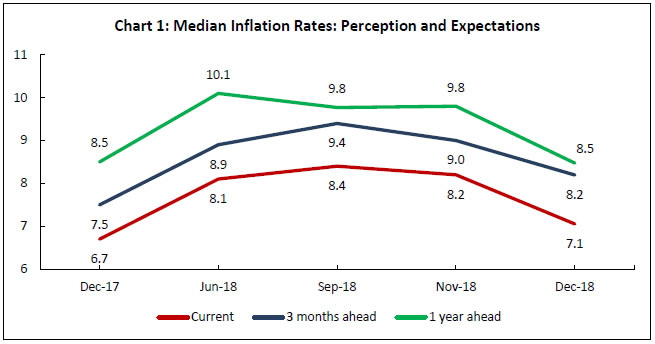 Today, the Reserve Bank released the results of the December 2018 round of the Inflation Expectations Survey of Households (IESH)1 2. The survey was conducted in 18 cities and the results are based on responses from 5,828 urban households. Highlights: i. The proportion of respondents expecting general prices to rise in the next three months and one year ahead horizons fell sharply in relation to the November 2018 round with a similar pattern observed in respect of most of the product groups, and especially for food and non-food products (Table 1a and 1b). ii. Respondents also moderated their expectations with respect to the rate of future price changes. (Table 1a and 1b). iii. In quantitative terms, three months ahead and one year ahead median inflation expectations dropped by 80 and 130 basis points (bps), respectively, from their readings in the November 2018 round (Chart 1, Table 2). iv. The decline in quantitative expectations was observed across various groups of the respondents (Table 2). Note: Please see the excel file for time series data.